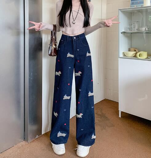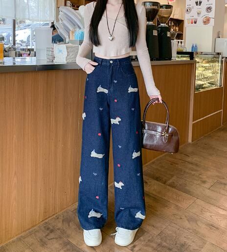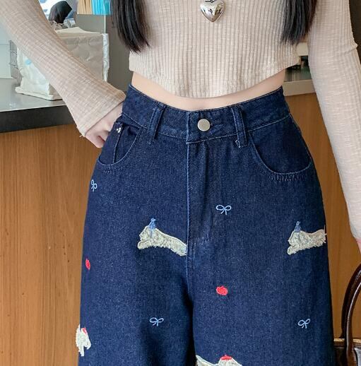 刺繍ワッペンデニムズボンボトムスパンツジーンズジーパンストレートロングシンプルダンス衣装ヒップホップ
