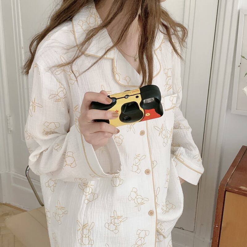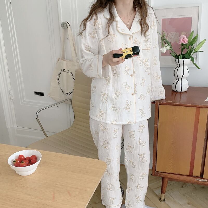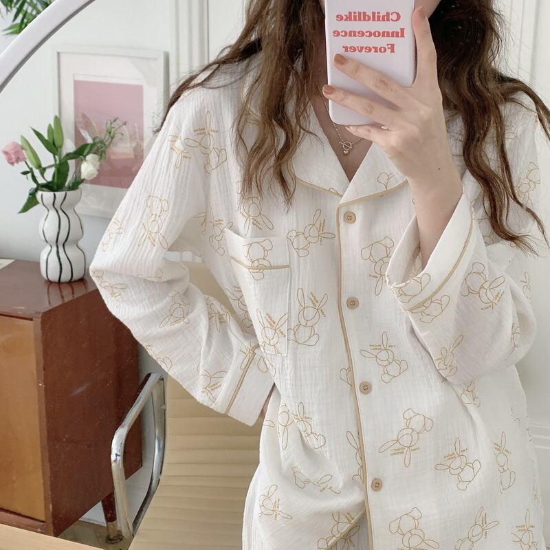 ウサギ匹 純綿 ガーゼ パジャマ着 女 春秋 長袖 ズボン ホームウェア 2枚セット