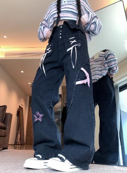 リボンワッペンデニムズボンボトムスパンツジーンズジーパンストレートロングシンプルダンス衣装ヒップホッ