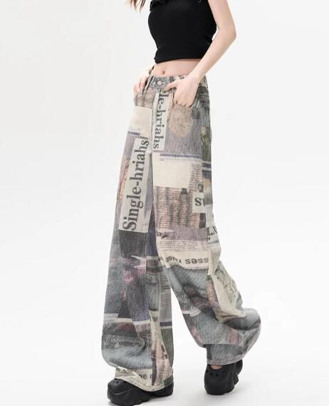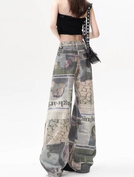 デニムズボンボトムスパンツジーンズジーパンストレートロング総柄新聞シンプルダンス衣装ヒップホップHI
