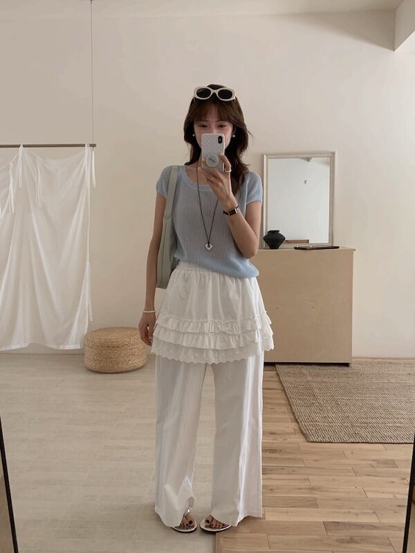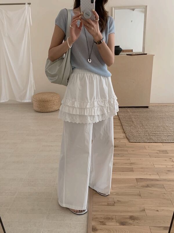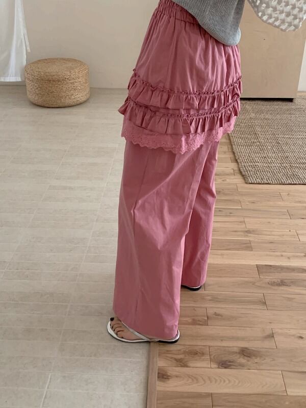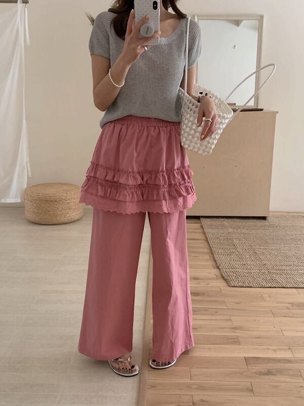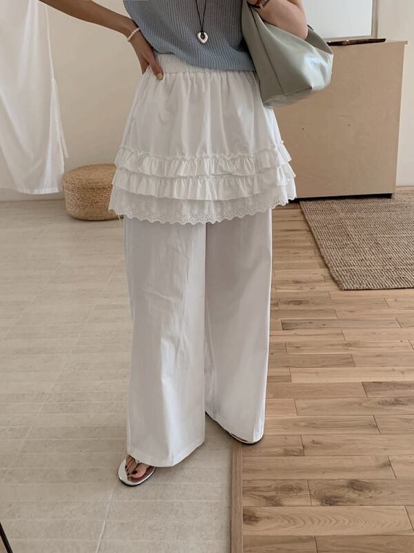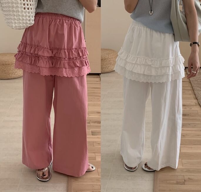 全2色 パンツ フリル 切り替え 体型カバー 着痩せ カジュアル