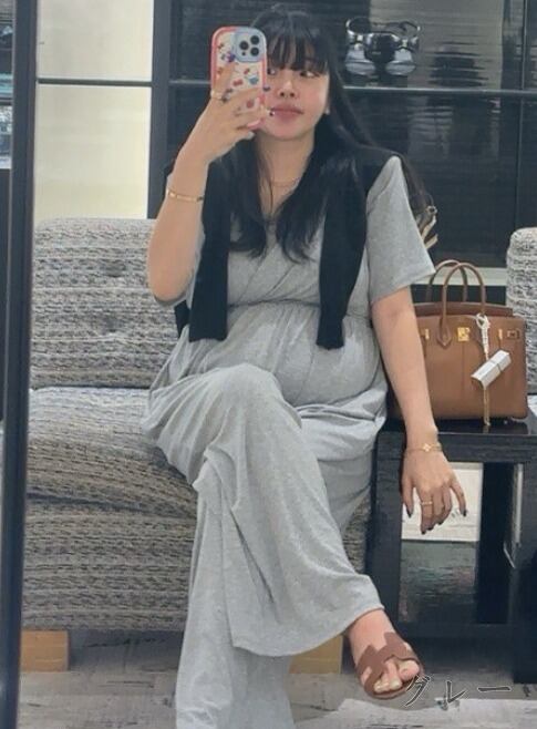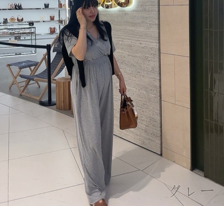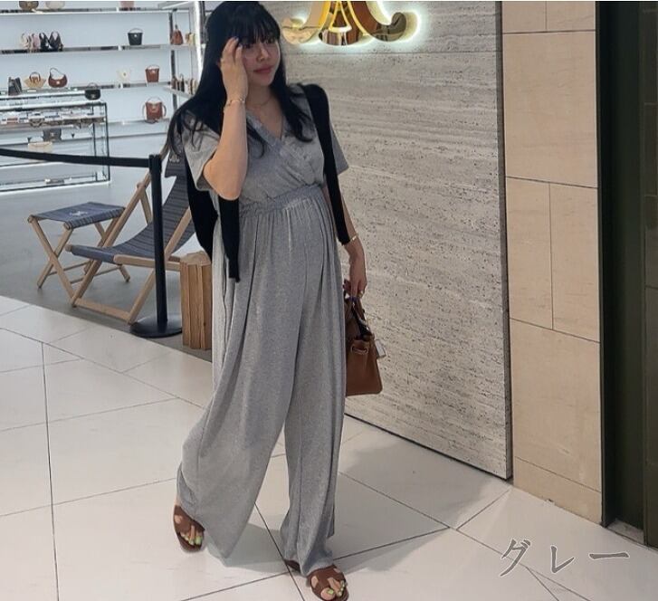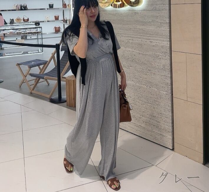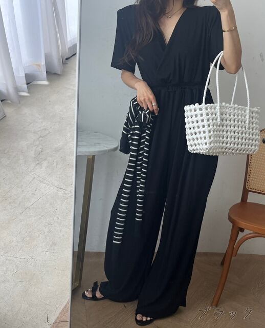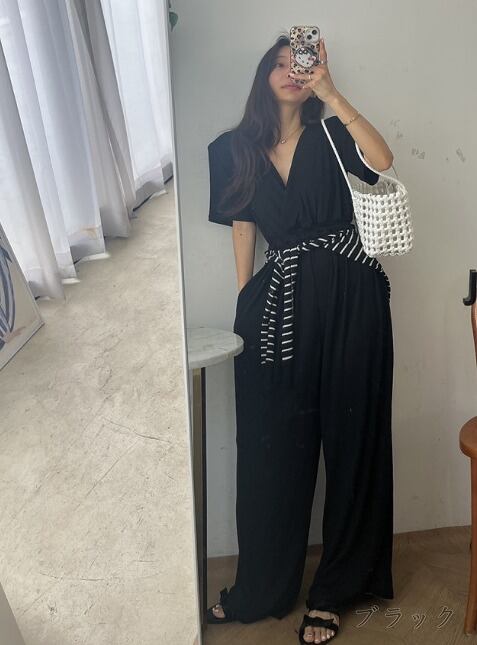 全2色 オールインワン オーバーオール Vネック 切り替え 体型カバー 着痩せ シンプル