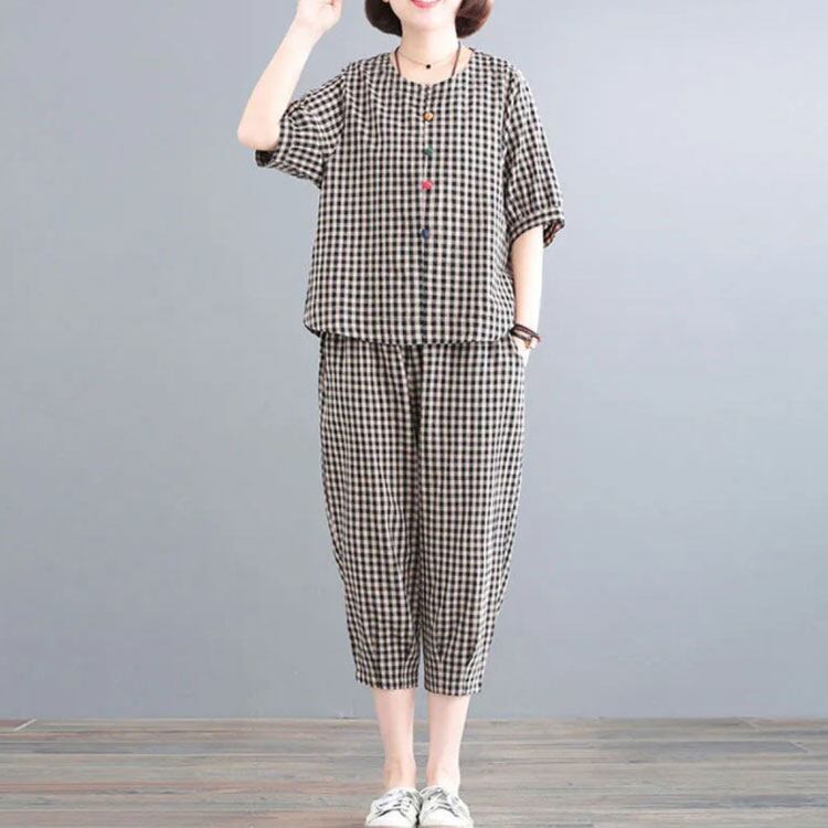 【送料無料】レディース セットアップ チェック柄 ブラウス 長ズボン プルオーバー 丸首