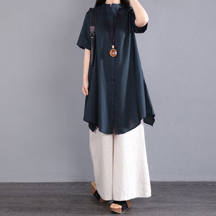 【送料無料】ブラウス チュニック 長ズボン セットアップ 綿麻混 バンドカラー ロングシャ