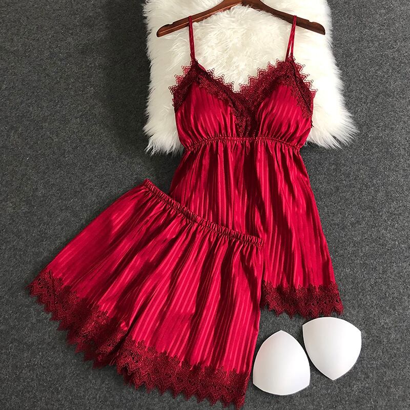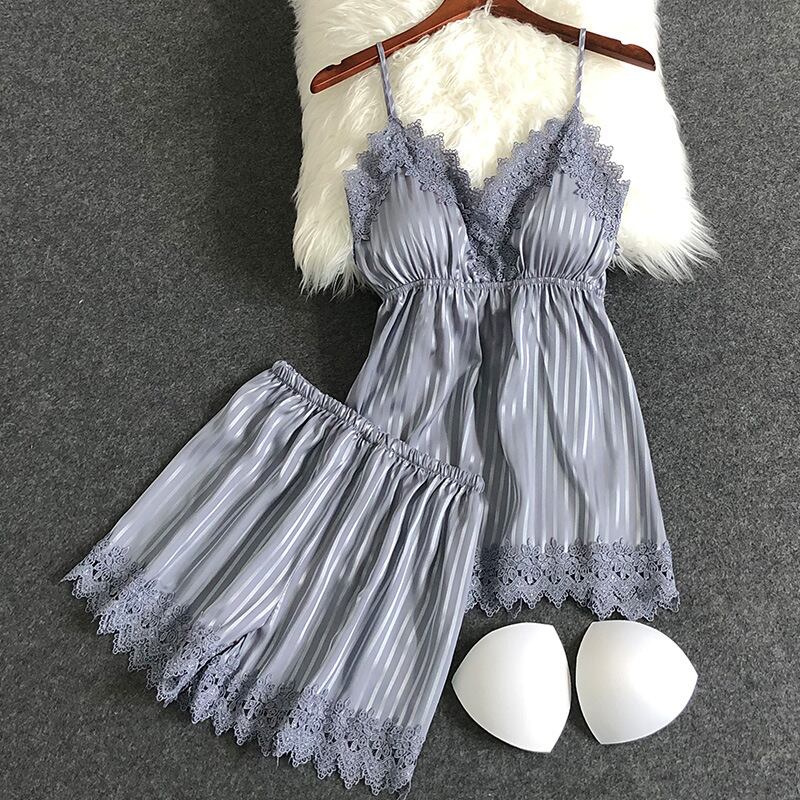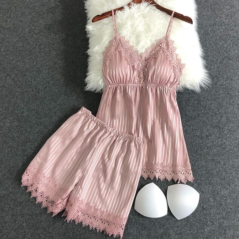 新しいパジャマ女性夏氷糸縞キャミソール半ズボン2枚セットの薄い家庭服