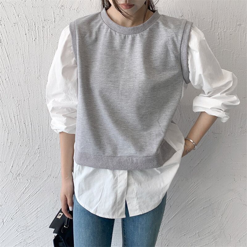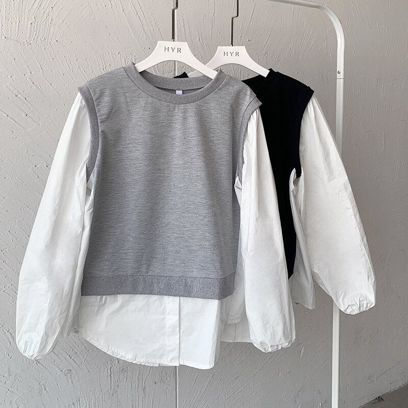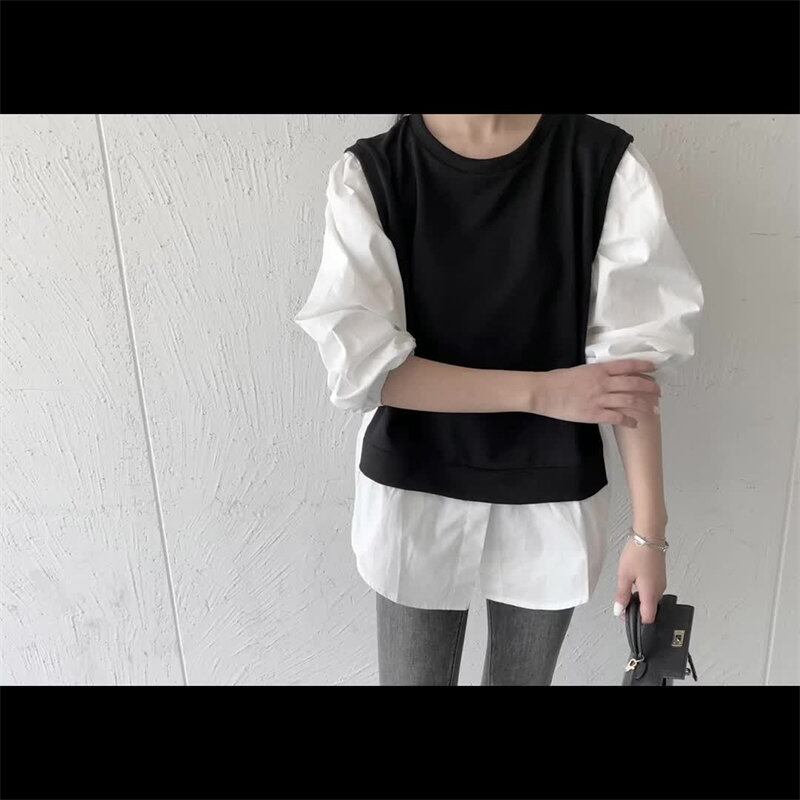 2023秋INS新作★韓国風 気質 ファッション 配色コットン トップス  偽2枚 長袖シャツ
