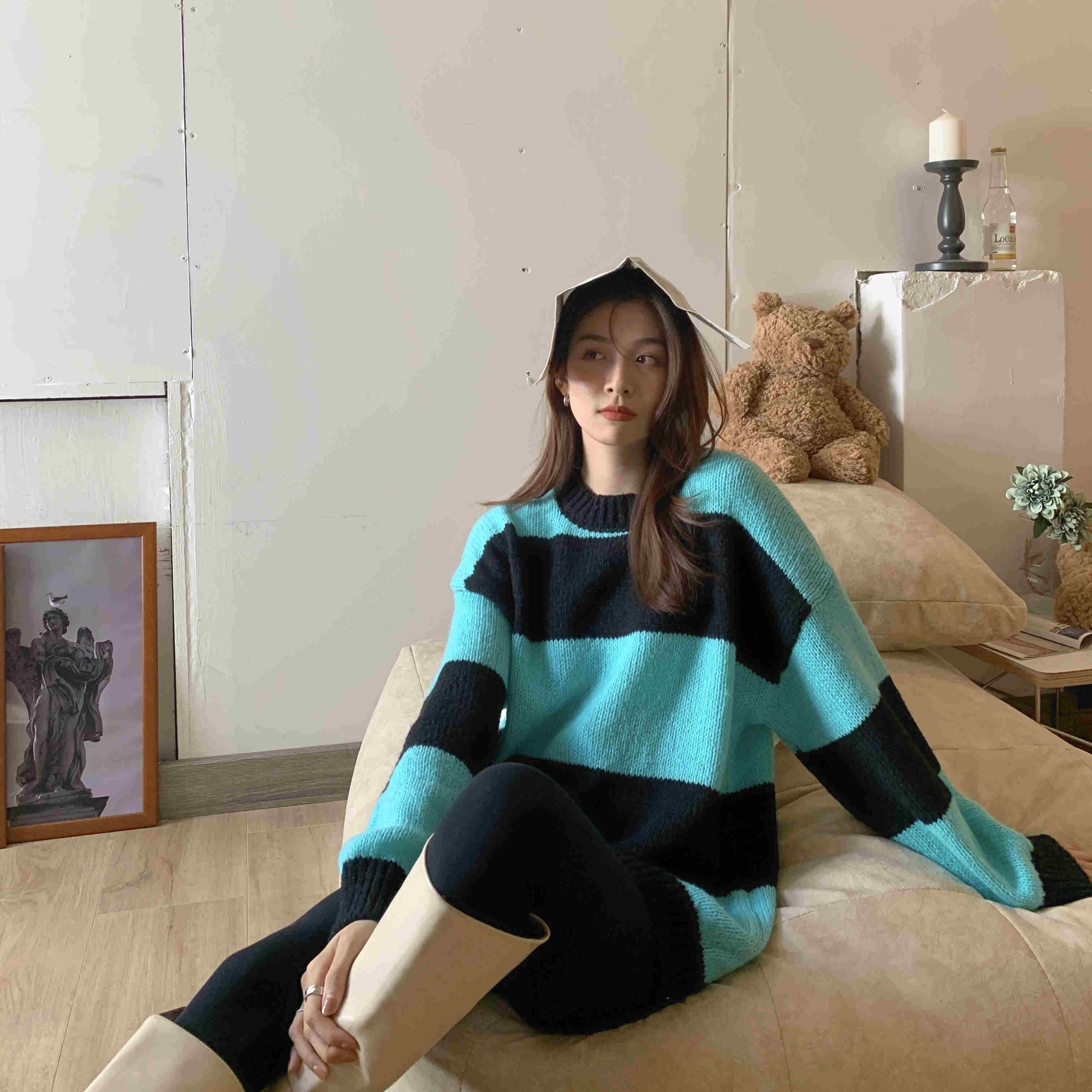 2023秋INS新作★カジュアル 韓国風 気質 ゆったり ストライプ柄 ラウンドネック ニットセーター