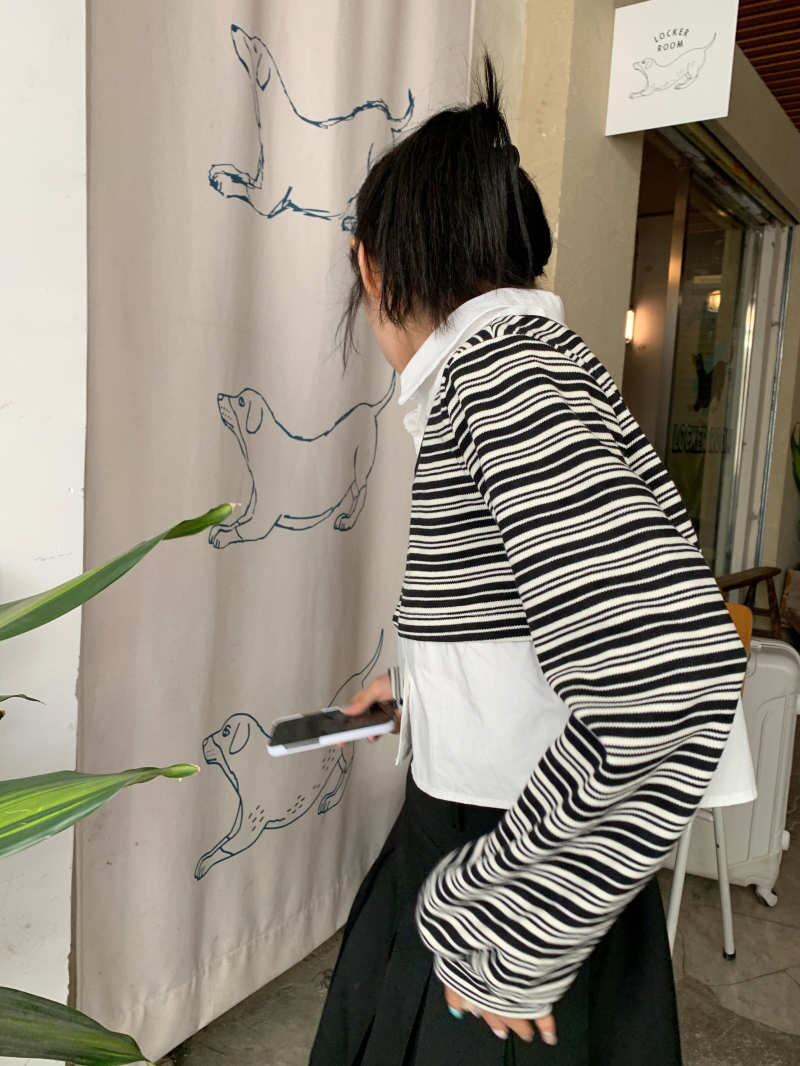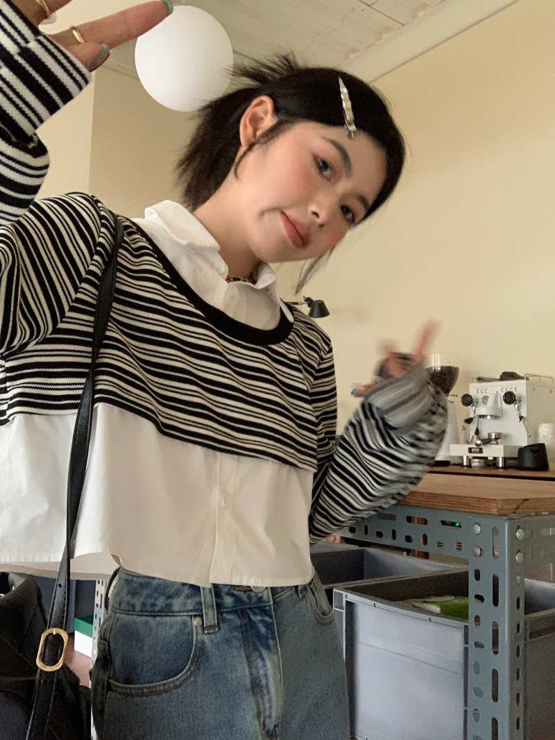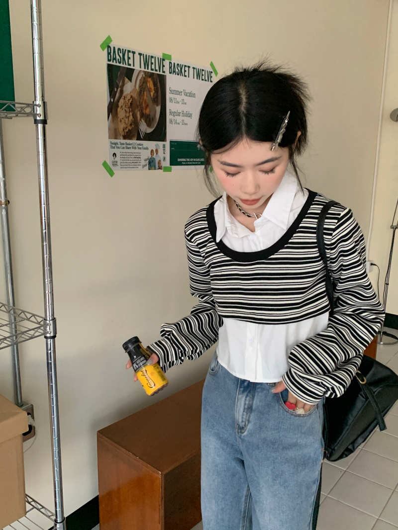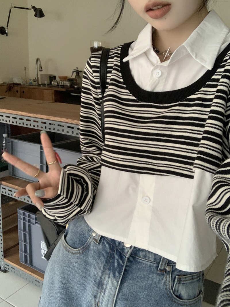 2023秋INS新作★カジュアル 韓国風 気質 着心地抜群 ストライプ柄 フェイクレイヤード ポロシャツ