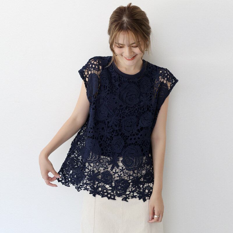 2023夏INS新作★韓国風 気質 スウィート プルオーバー 透かし彫り レース 半袖 2点セットアップ