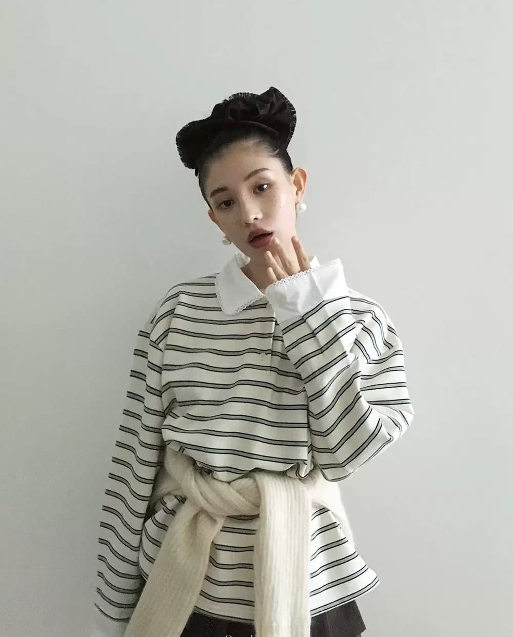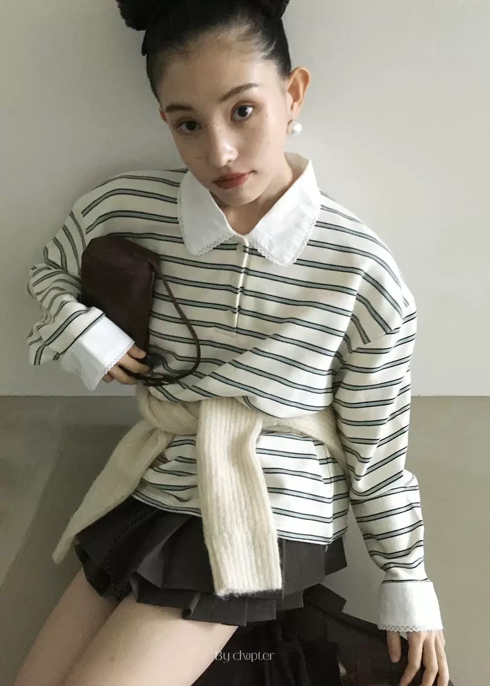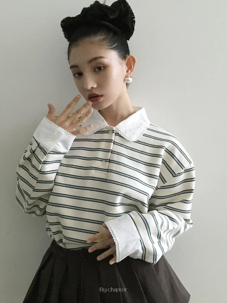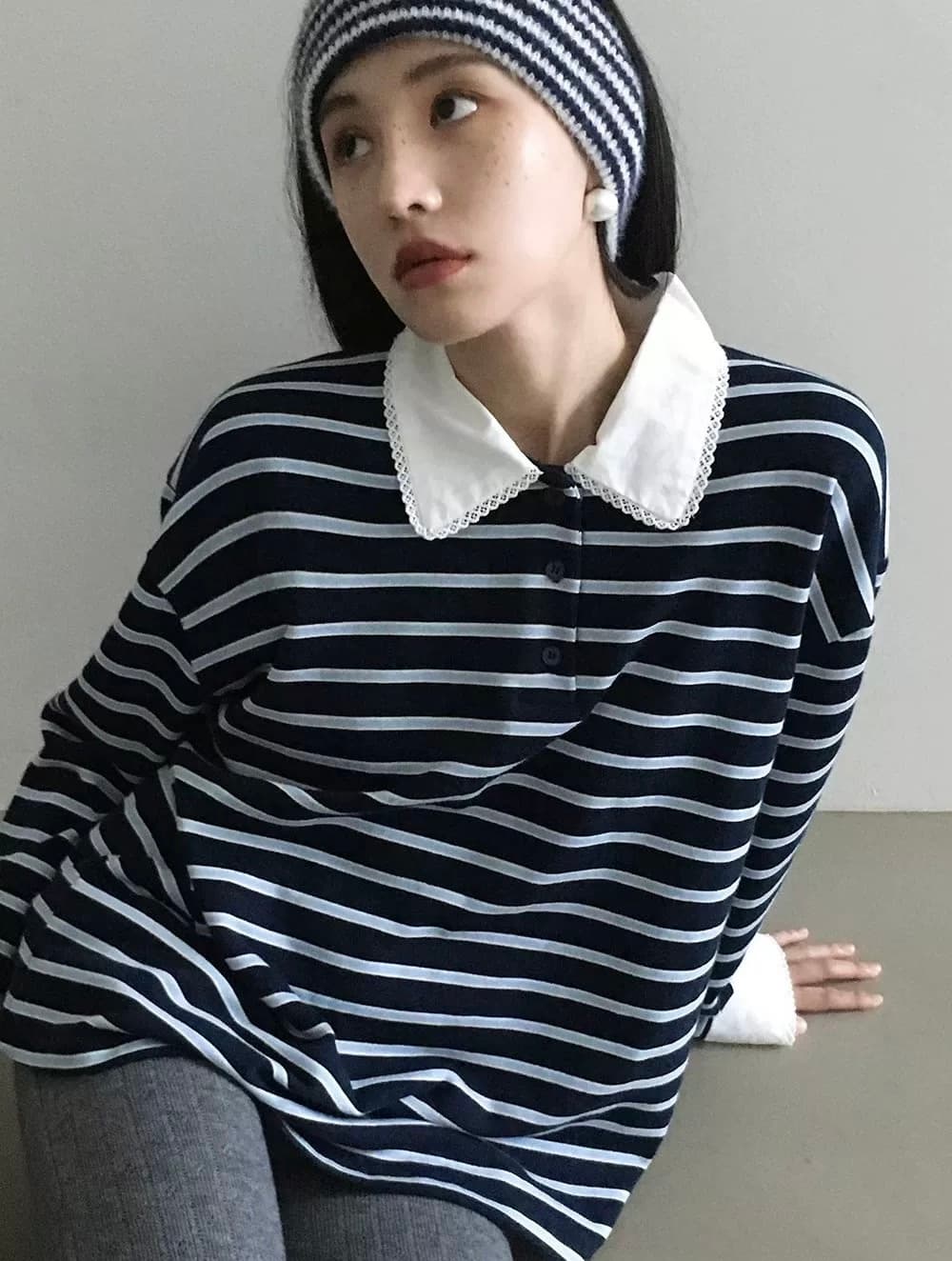 2026年INS 春新作 気質 おしゃれ フリル衿 ストライプ ロングスリーブ T シャツ