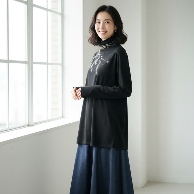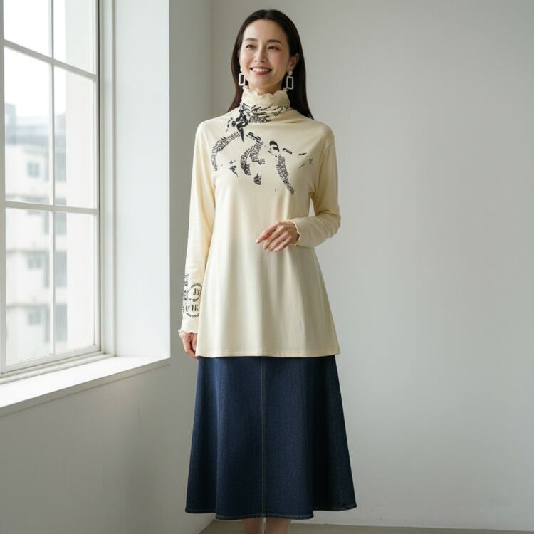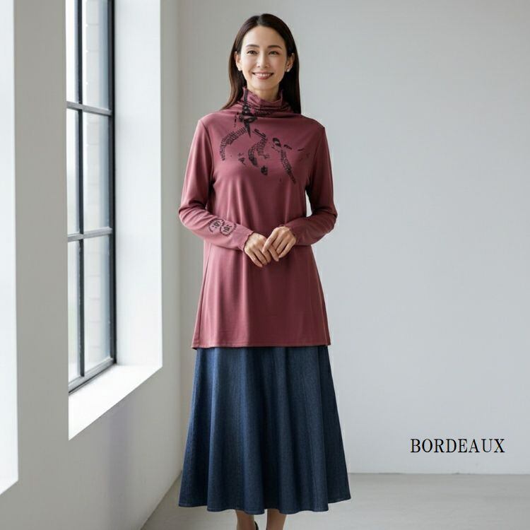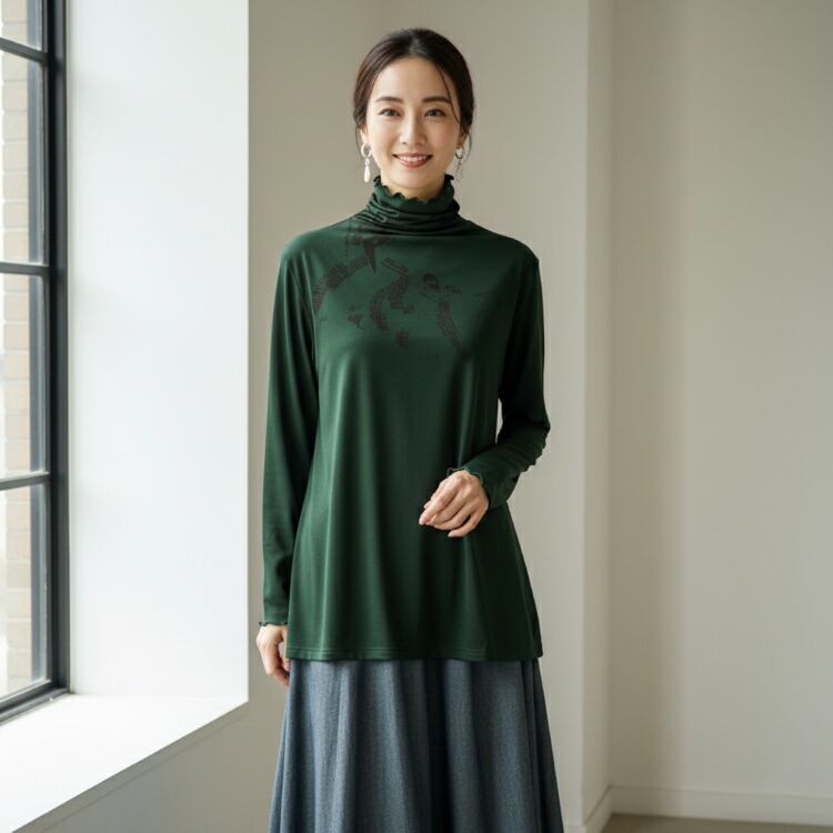 ロング丈Aラインプルオーバー メロー仕上げ 長めタートルネック T391