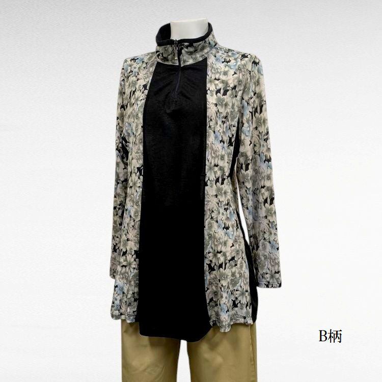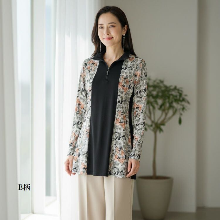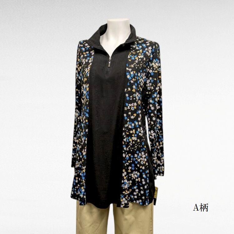 ゆったりAライン ハーフジップ長袖シャツ 強撚ストレッチカットソー A、B柄