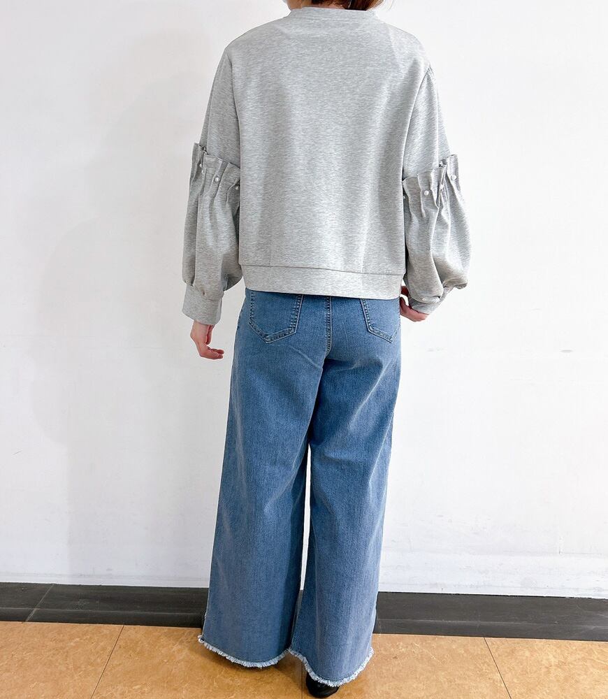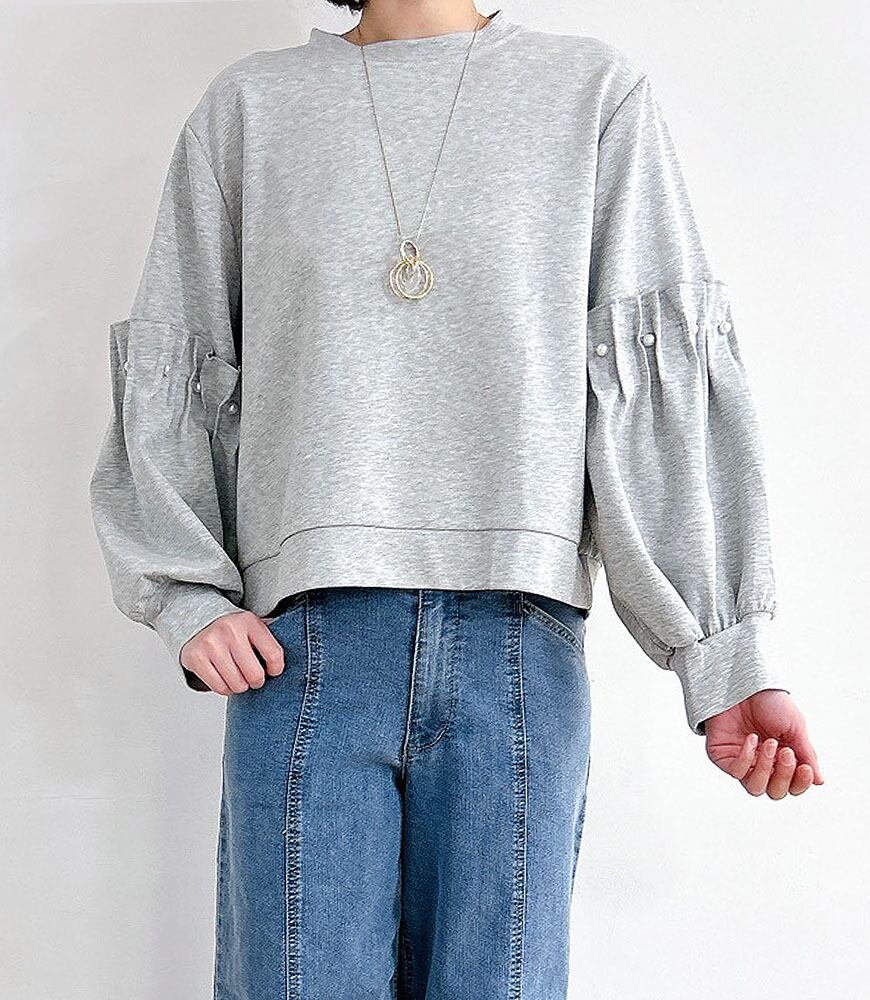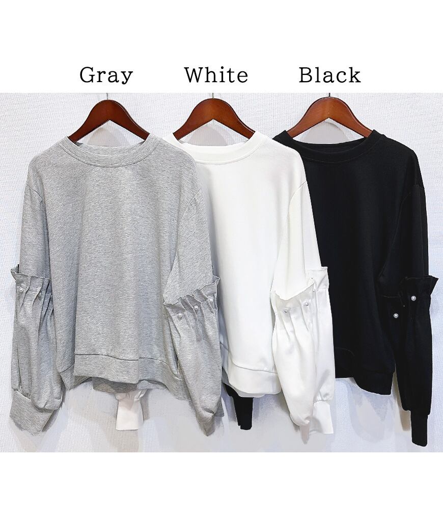 【2026新作】ギャザー スリーブ パール 切替 プルオーバー トップス スエット