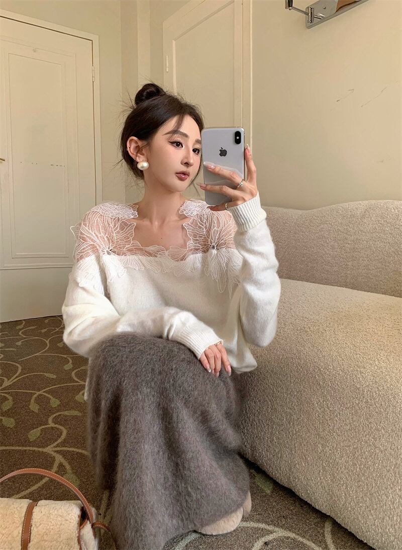 春INS 新作 気質 レトロ おしゃれ カジュアル レース 切り替え ニットセーター