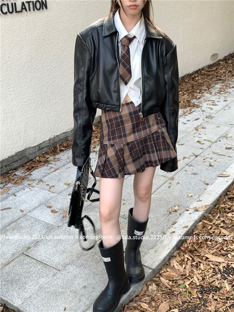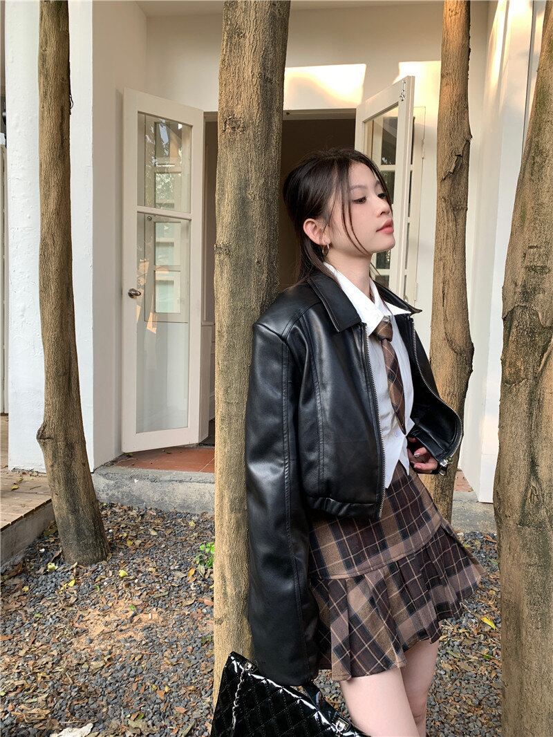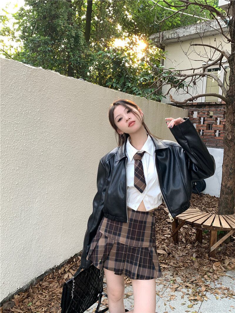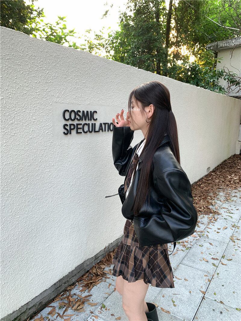 2024年春INS 新作 合わせやすい ゆったり 長袖 PU 折り襟 ジッパー ミニ丈 秋 ジャケット