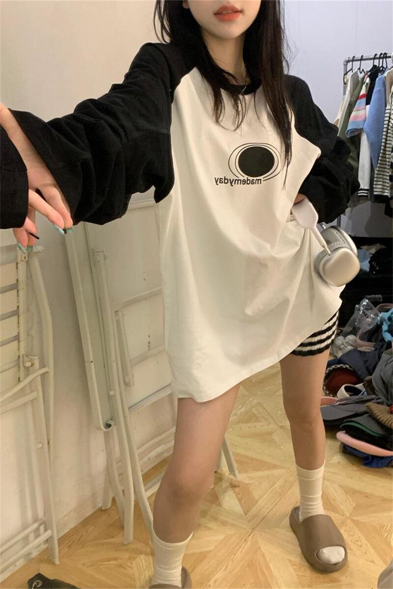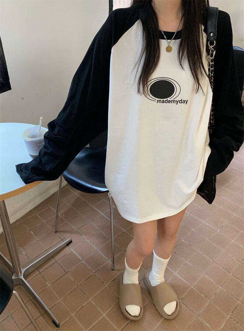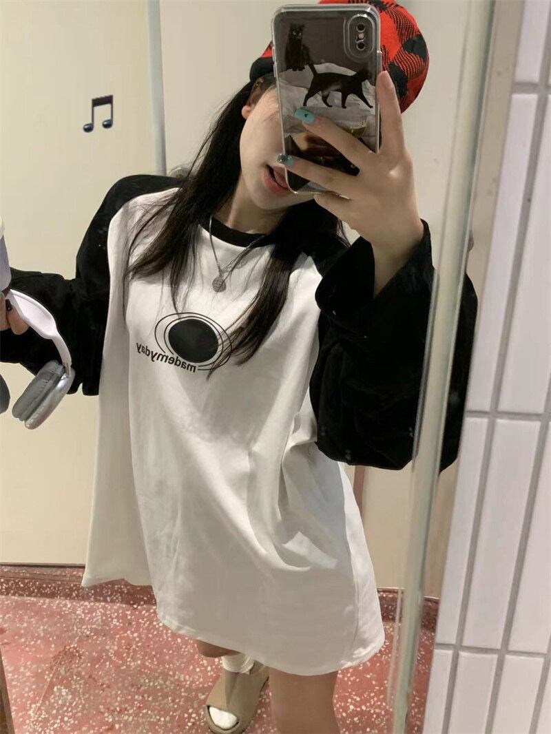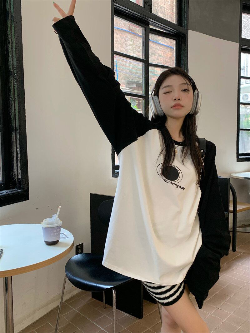 春INS 新作 気質 レトロ おしゃれ カジュアル 長袖 配色 Tシャツ
