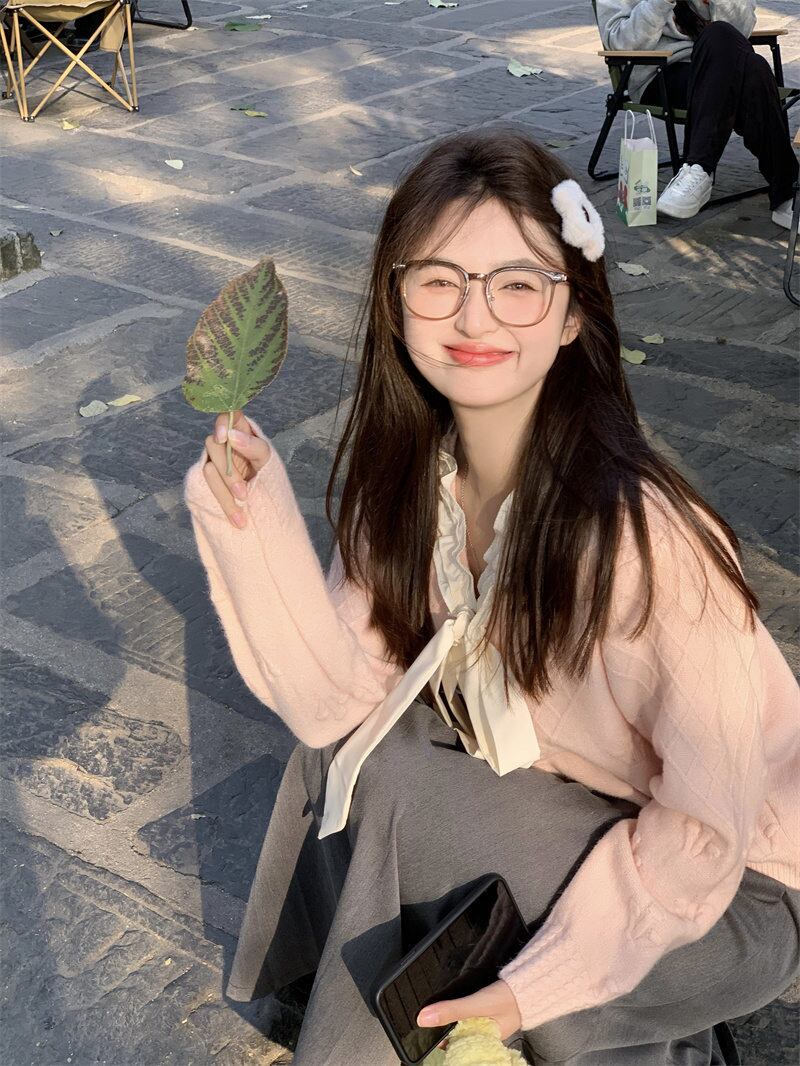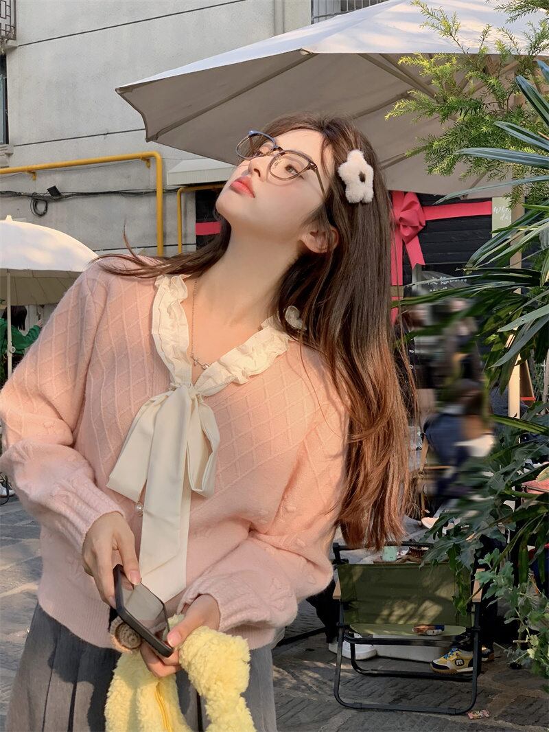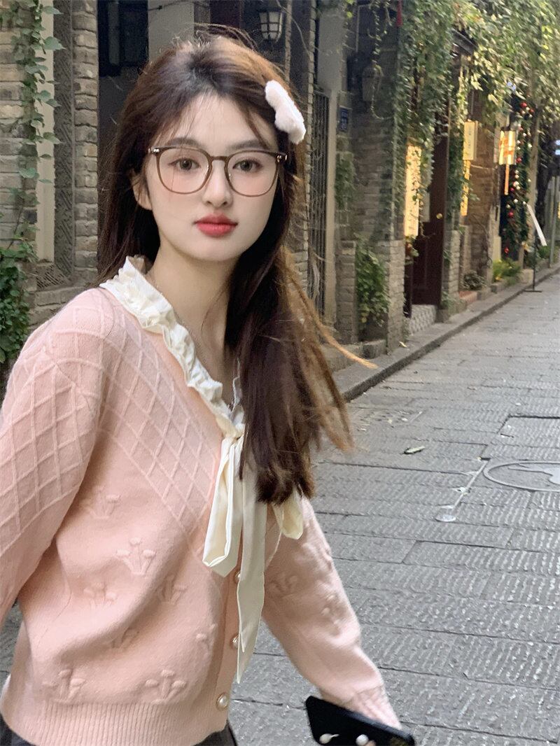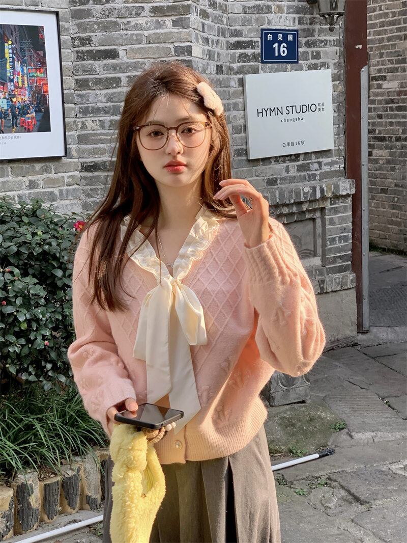 2023年冬新作 レトロ レイジー風 合わせやすい 長袖 ニット生地 リボン カーディガン