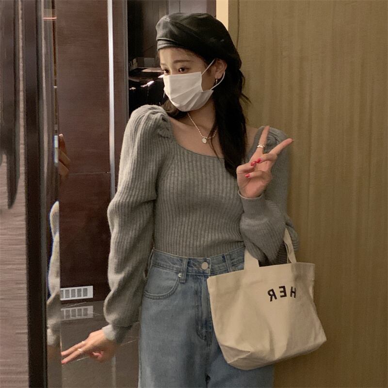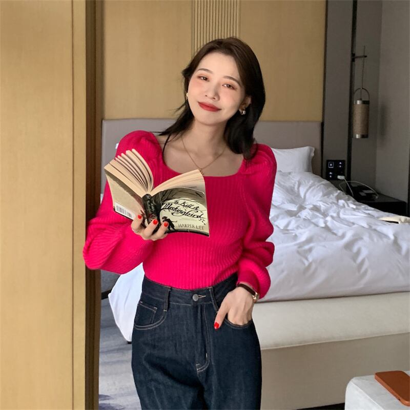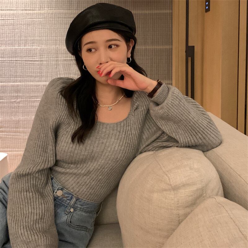 INS 秋新作 長袖 ニット スクエアネック カジュアル ニットウェア スウィート