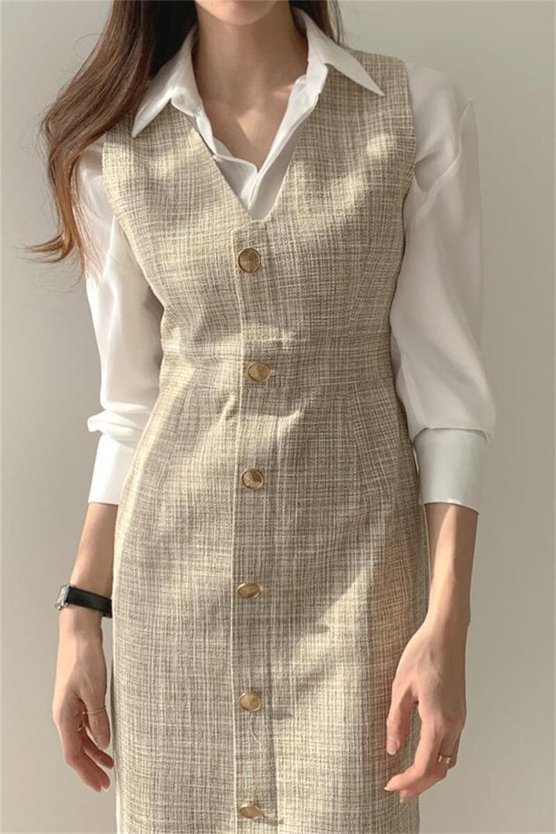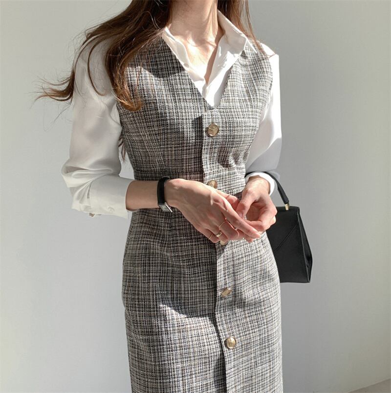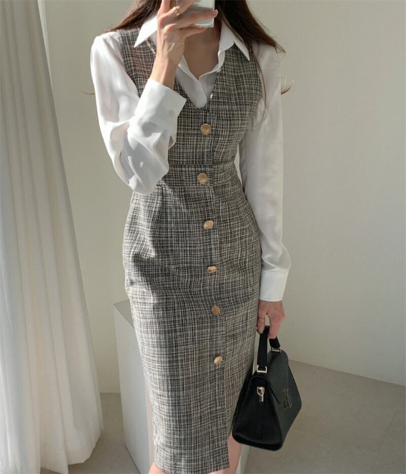INS 秋新作 チェック 袖無し タンクトップ/キャミソール ワンピース シャツ