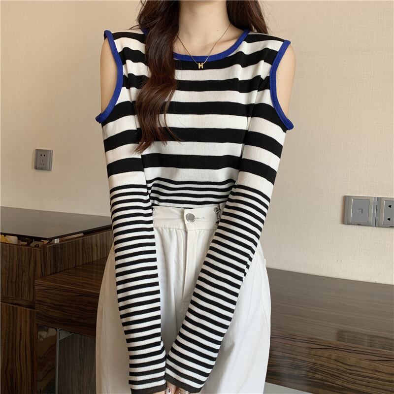 INS 秋新作 ファッションスタライプ柄 ニット生地 長袖 オフショルダー セーター
