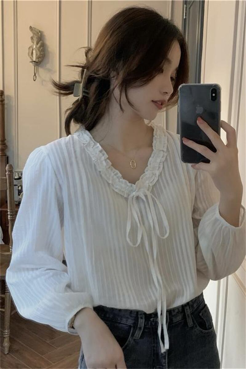 INS 秋新作 ファッション レトロ 気質 シンプル 長袖 Vネック シャツ/ブラウス