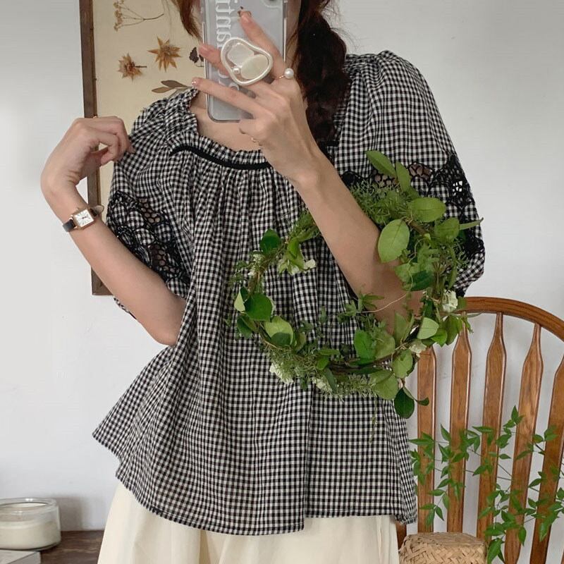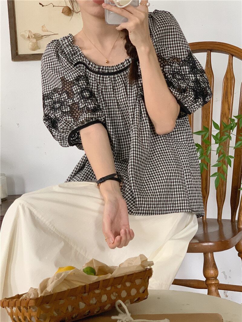 INS 夏新作 透かし彫り レース飾り レーシング パフスリーブ チェック柄 シャツ/ブラウス