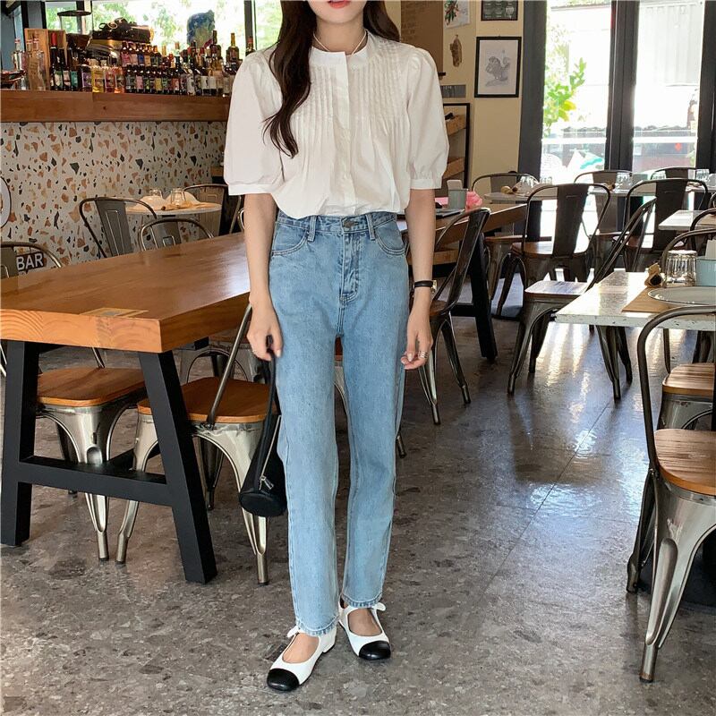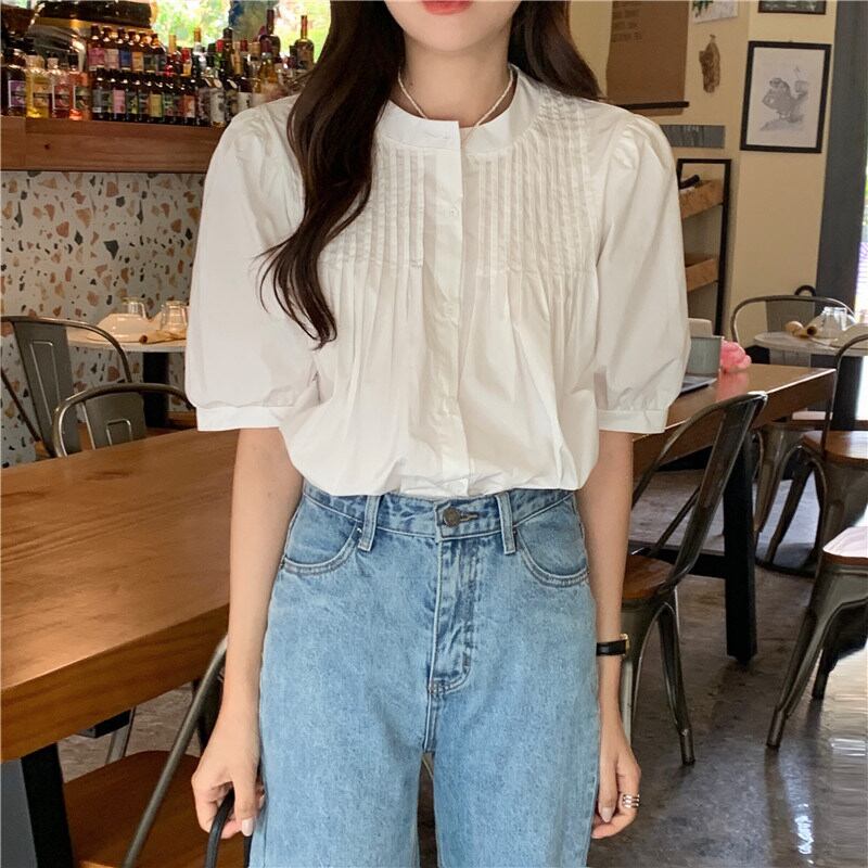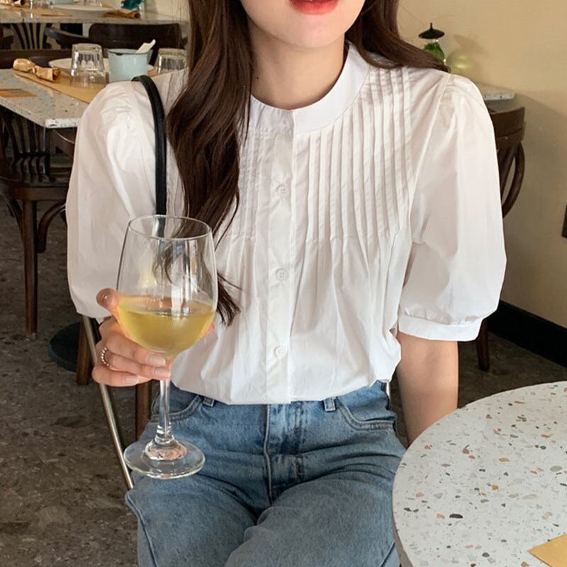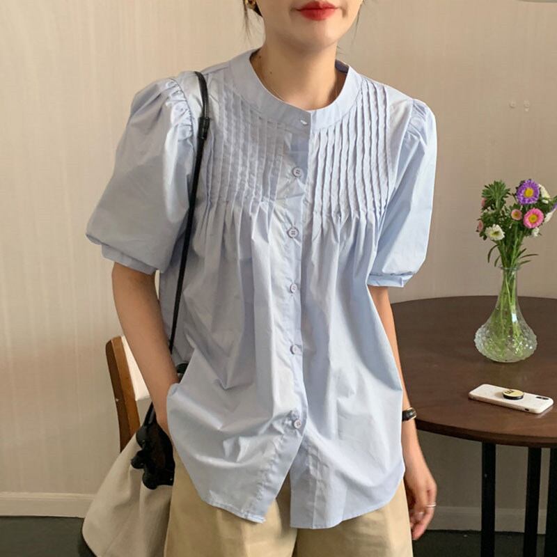 INS 夏新作 カジュアル パフスリーブ ラウンドネック シングルブレスト シャツ/ブラウス