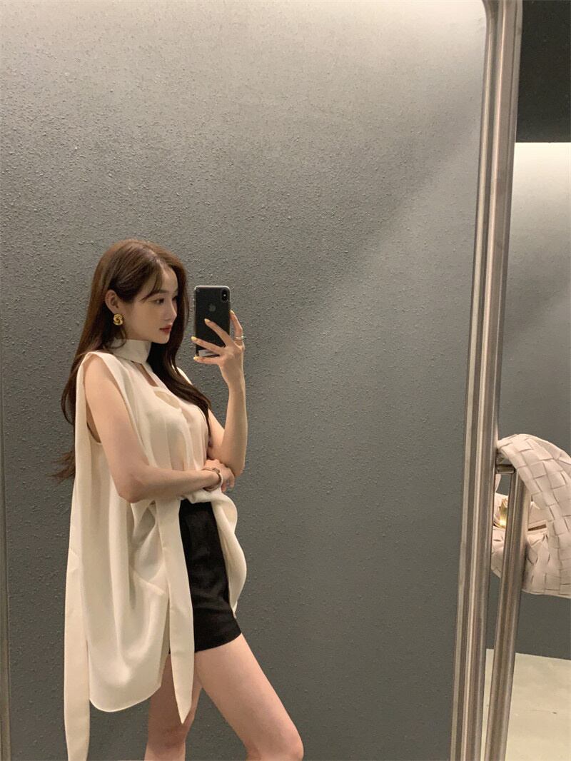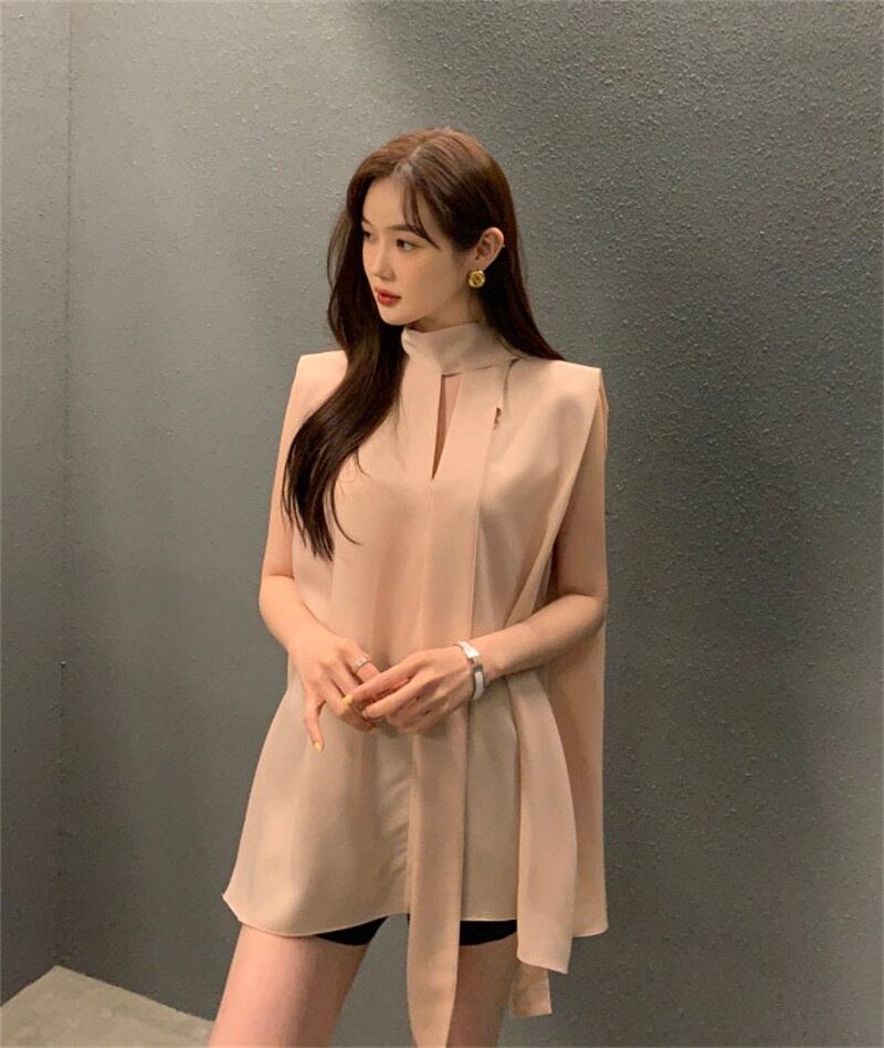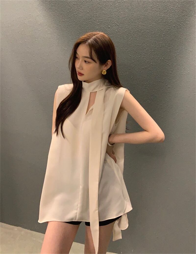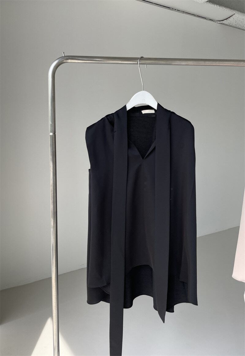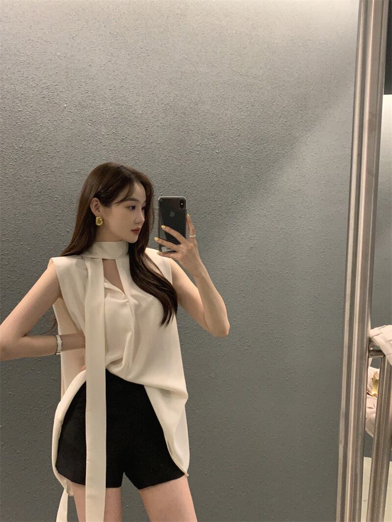 INS 新作 カジュアル 合わせやすい リボン Vネック 無地 ノースリーブシフォンシャツ