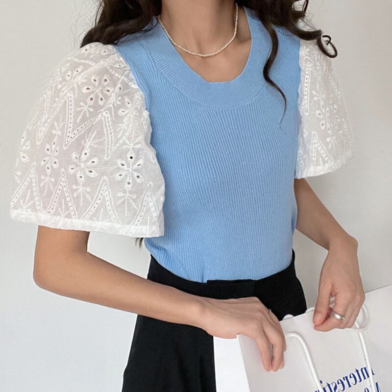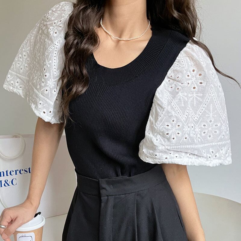 2022夏INS 気質 透かし彫り 半袖 ニット生地 ラウンドネック 配色 セーター/カットソー