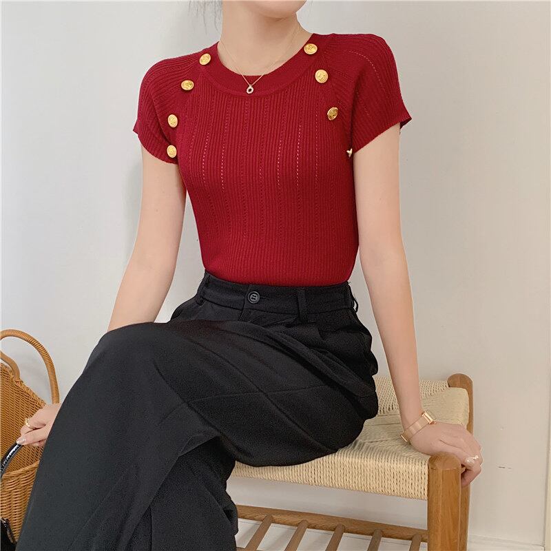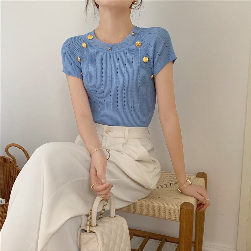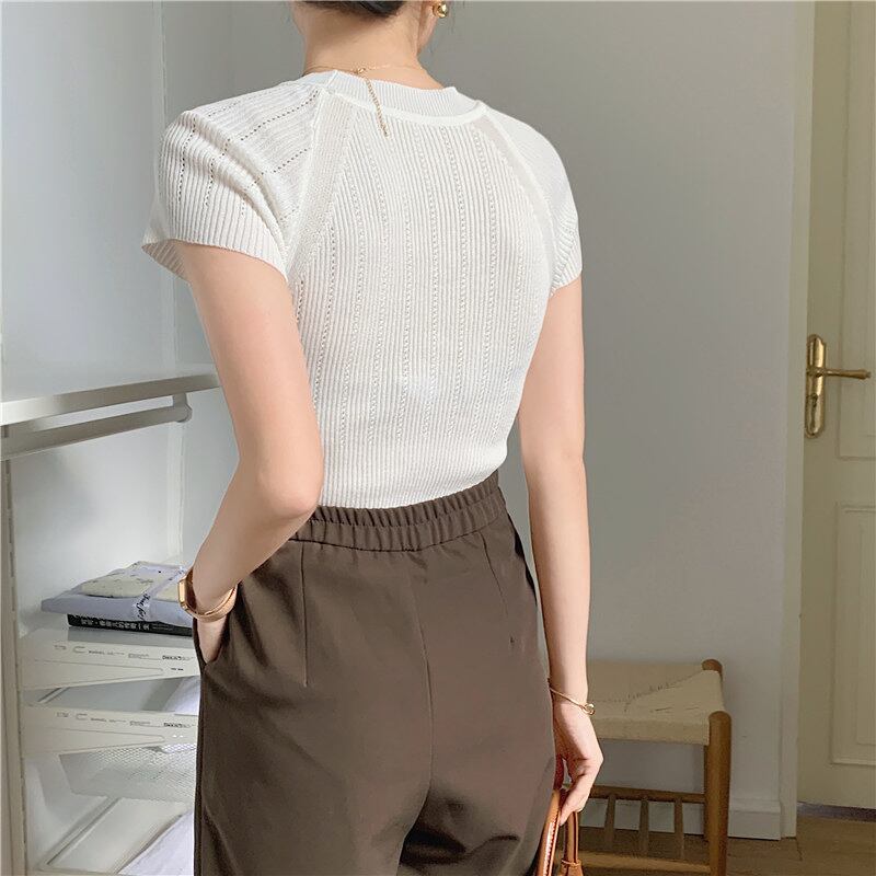 2022夏INS 気質 シンプル ニット生地 無地 セーター/カットソー
