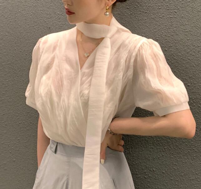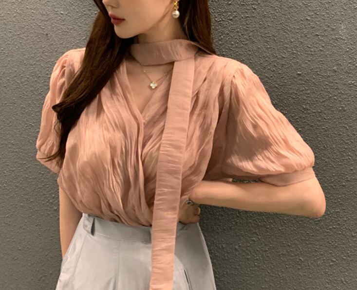 2022夏INS 気質 エレガント ゆったり プリーツ パフスリーブ Vネック シャツ/ブラウス