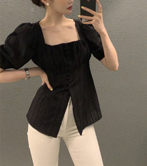 2022夏INS レトロ ゆったり プリーツ パフスリーブ スクエアネック シャツ/ブラウス
