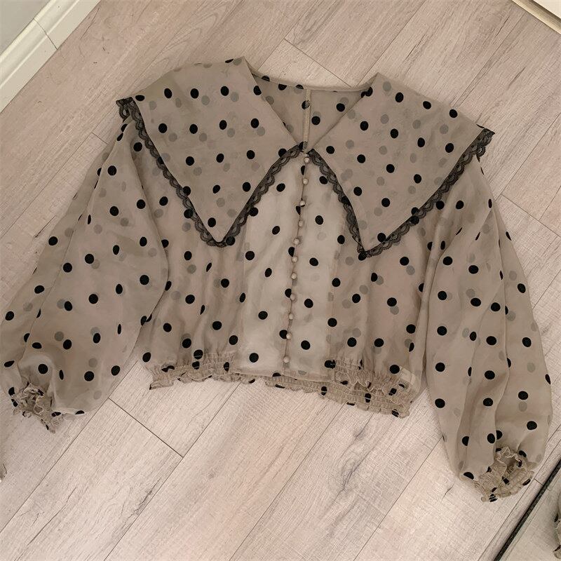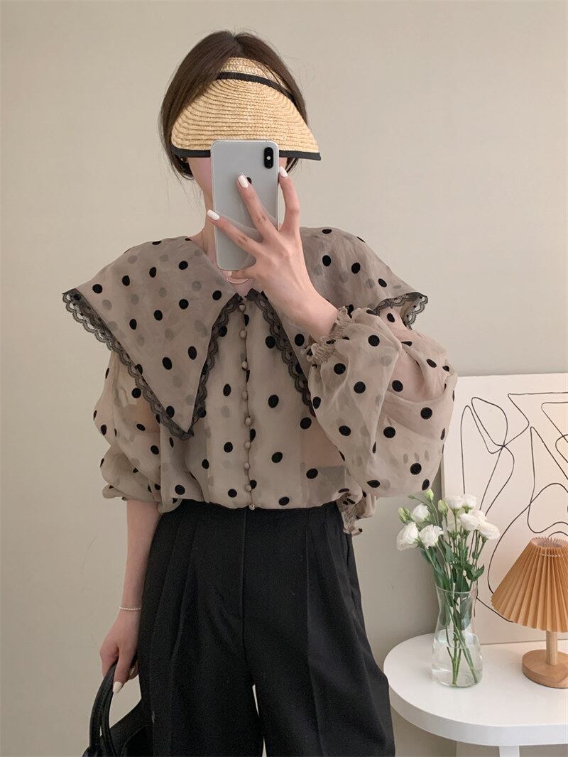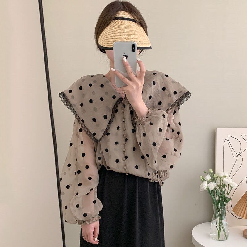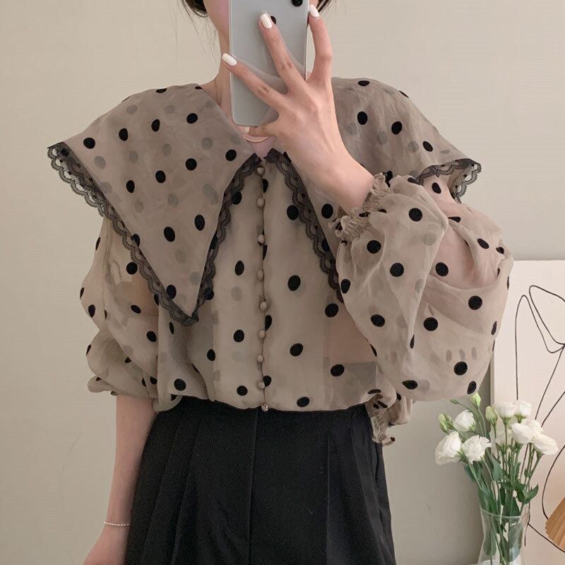 2022夏INS レトロ 合わせやすい 長袖 折り襟 ドット柄 シングルブレスト シャツ/ブラウス
