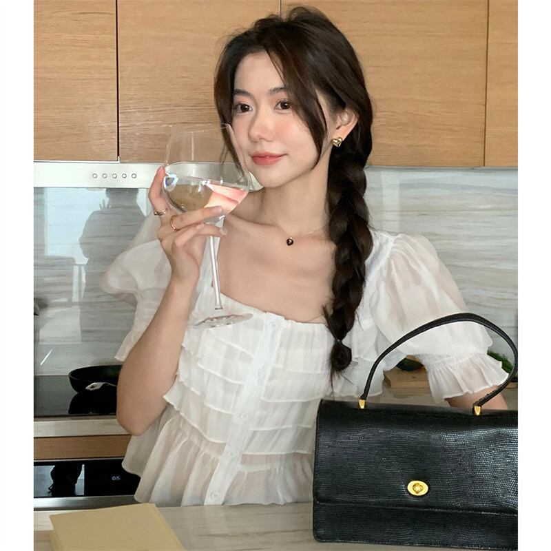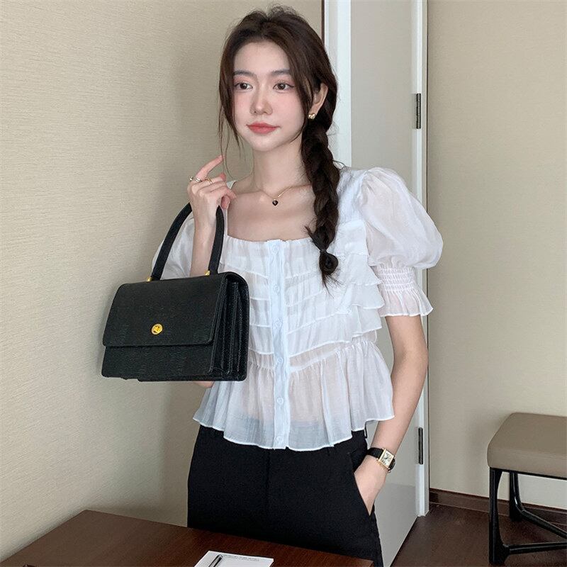 2022夏INS カジュアル レース飾り パフスリーブ 切り替え シャツ/ブラウス