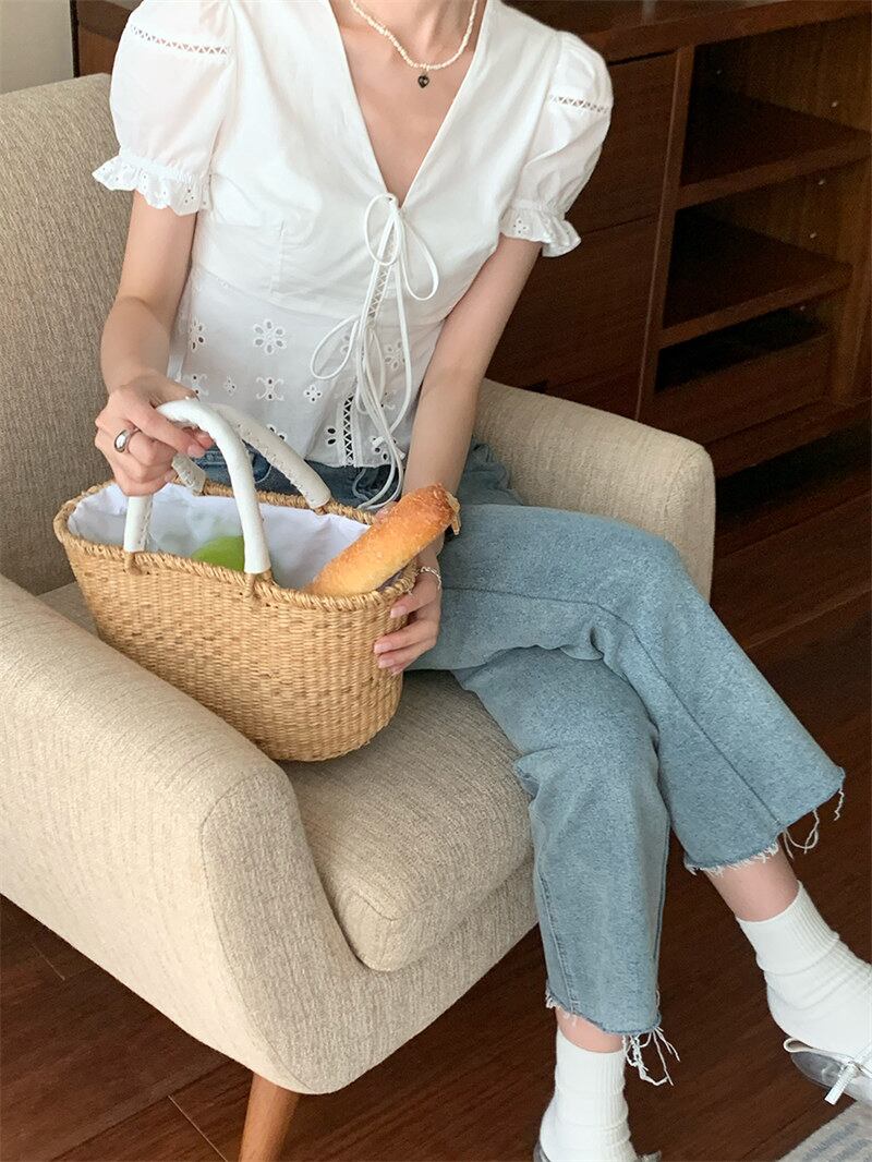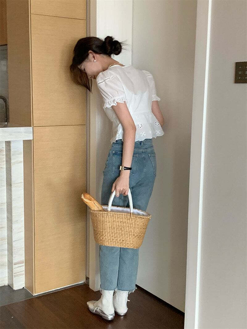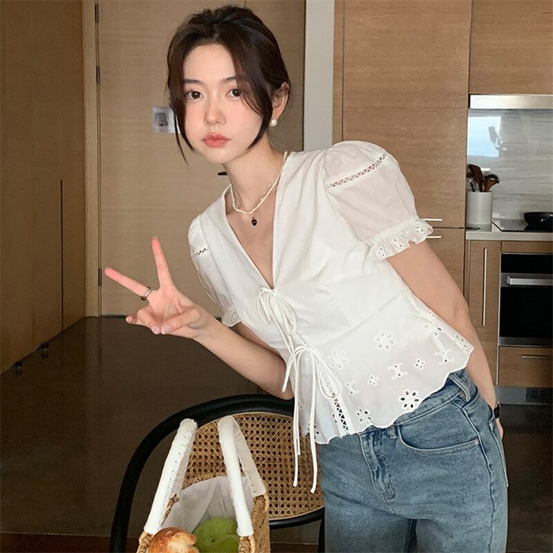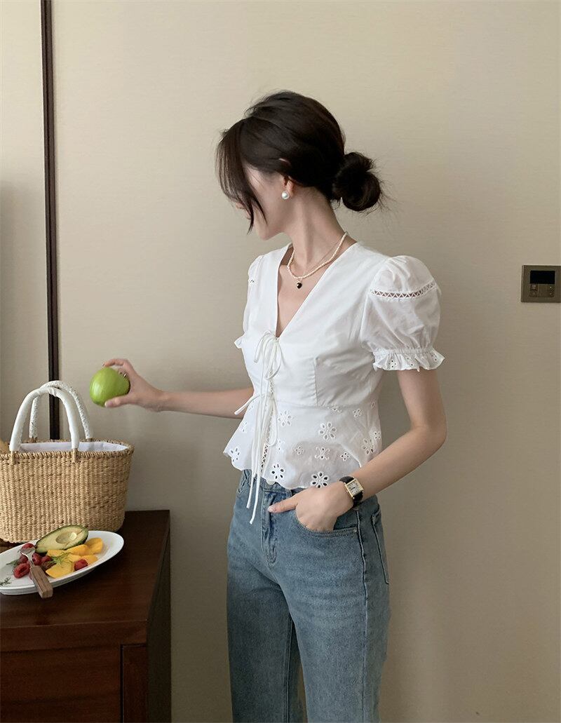 2022夏INS カジュアル レース飾り リボン パフスリーブ 切り替え シャツ/ブラウス
