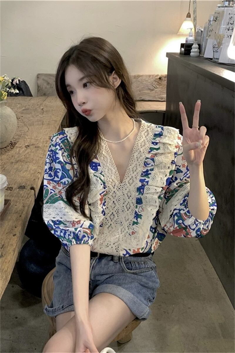 2022夏INS レトロ 気質 エレガント 透かし彫り Vネックシャツ/ブラウス
