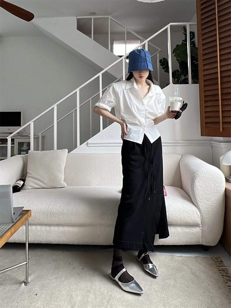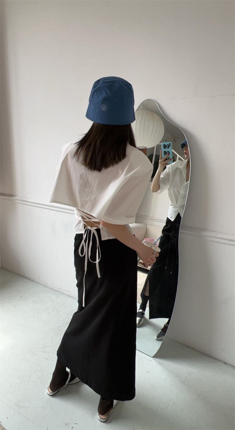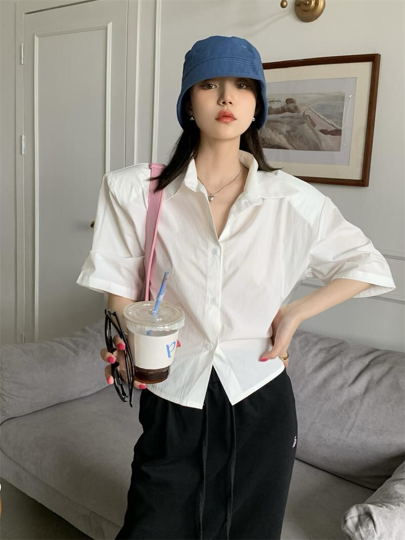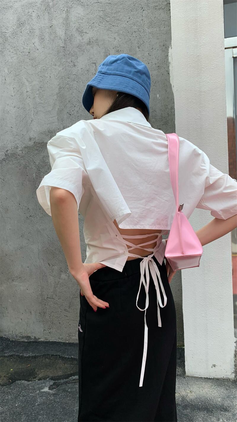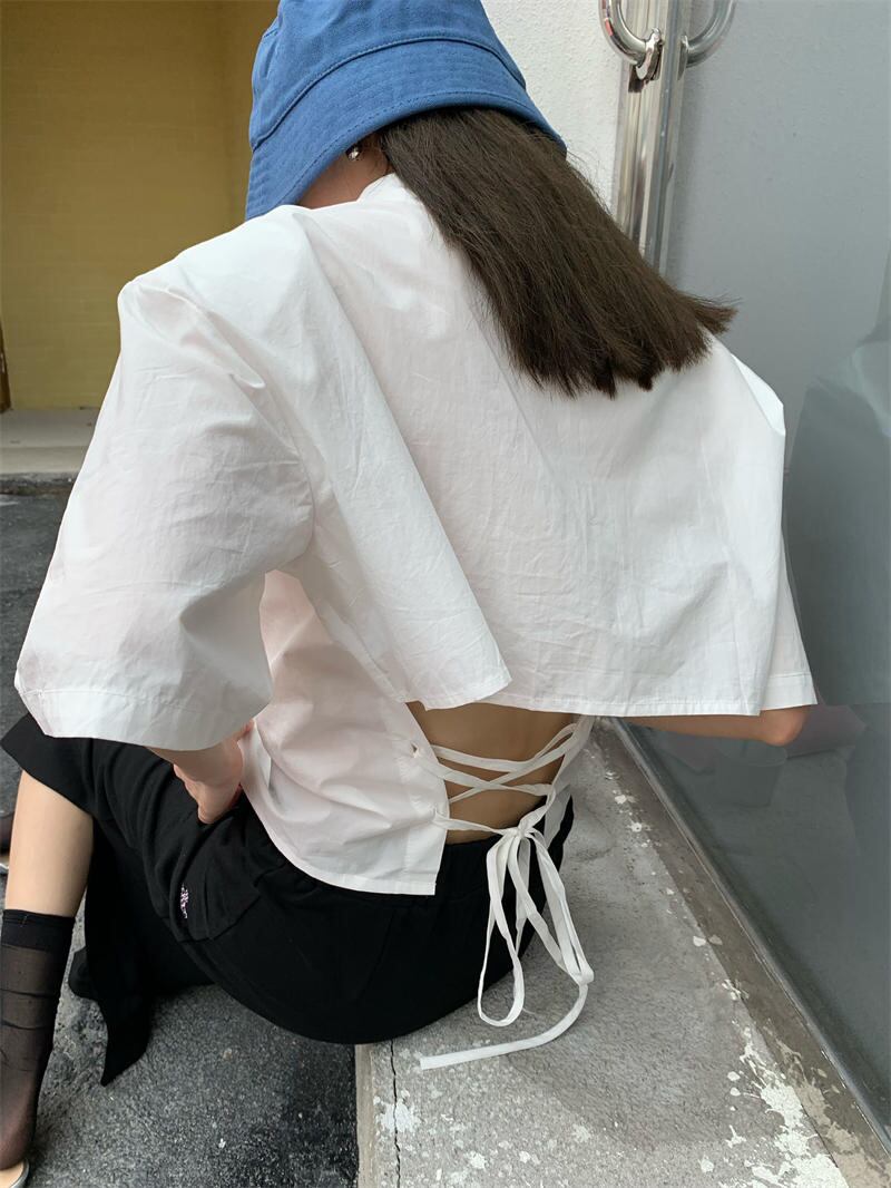 2022夏INS ゆったり 透かし彫り レーシング 半袖 折り襟 夏 シャツ/ブラウス
