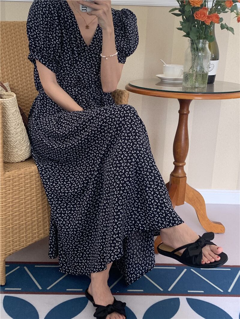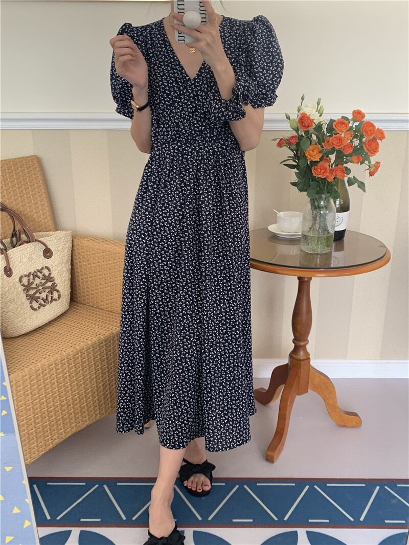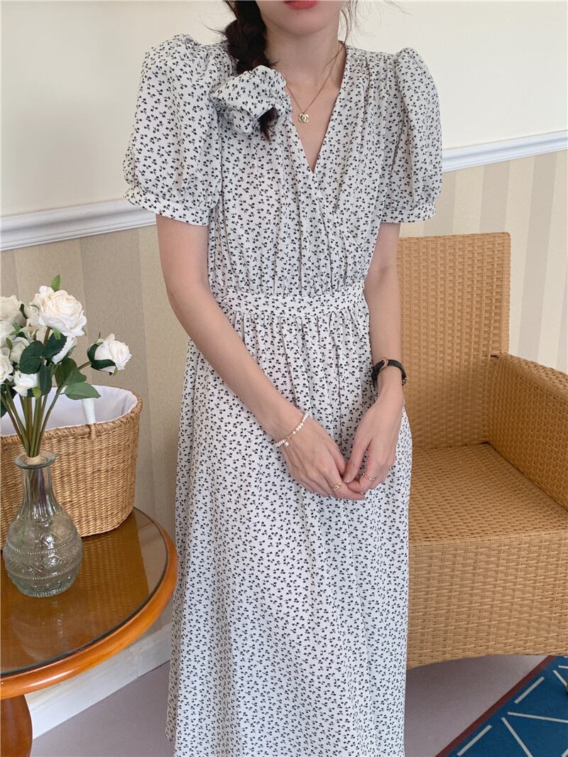 【2022夏INS 新作】気質 パフスリーブ Vネック 花柄 プリントワンピース