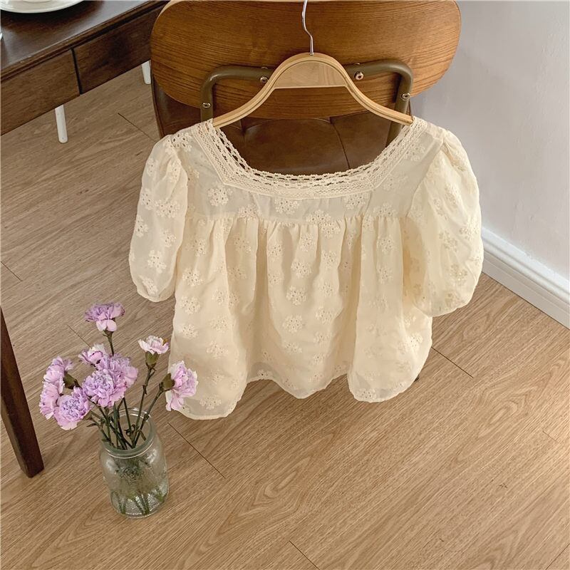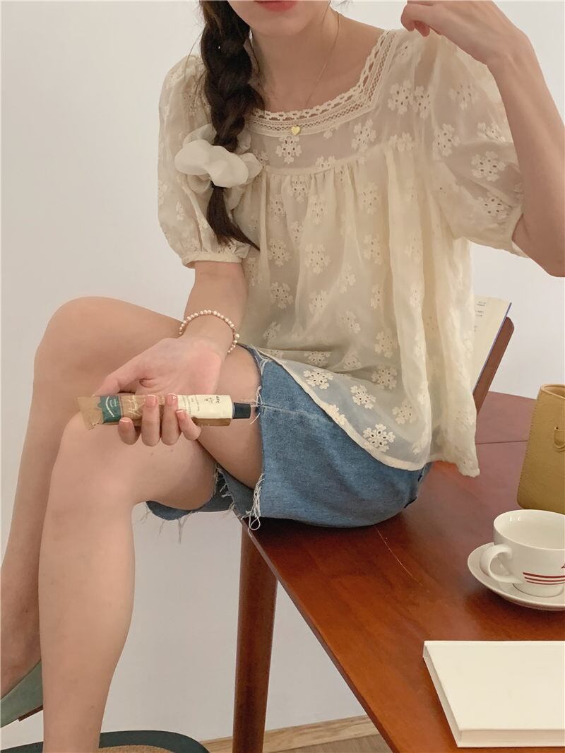 新作 エレガント 透かし彫り 刺繡 レース飾り パフスリーブ スクエアネック 花柄 シャツ/ブラウス