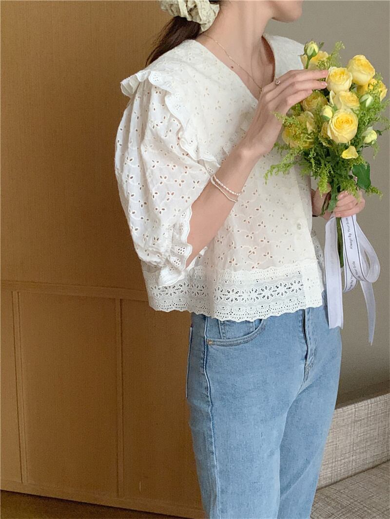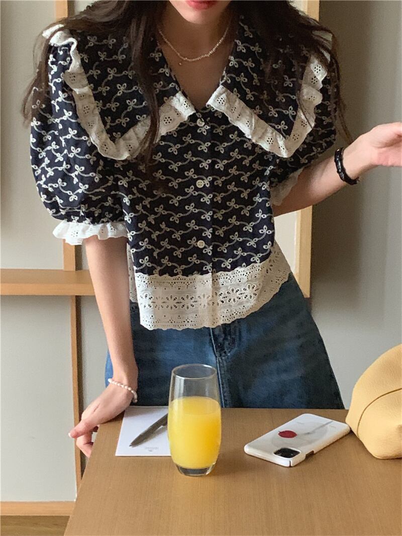 2022夏新作 レトロ 若く見え ゆったり レース飾り パフスリーブ 花柄 シングルブレスト ブラウス