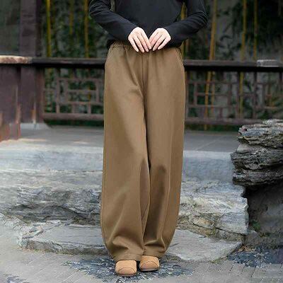 カジュアルボトムス レディース 冬 裏起毛 厚手 新チャイナ風 レトロ ゆったり ワイドパンツ 奥利絨素材 保温 防寒 ハイウエスト テンセル 綿混 極暖