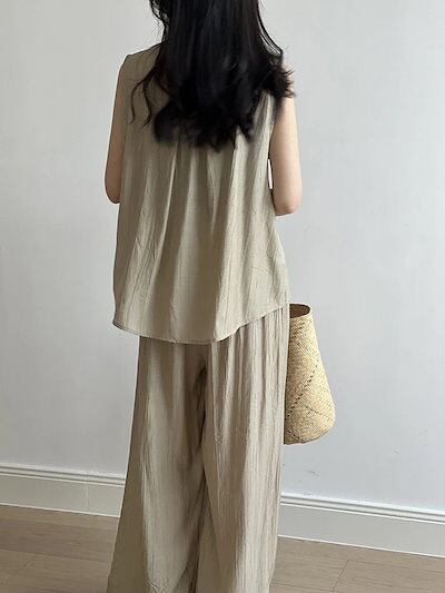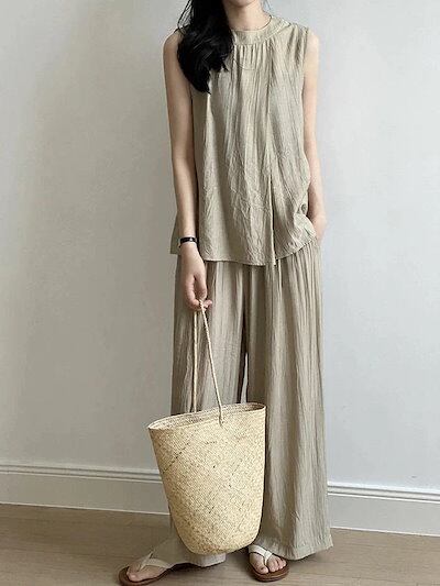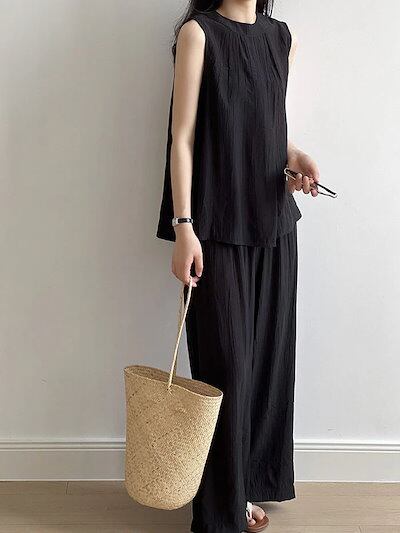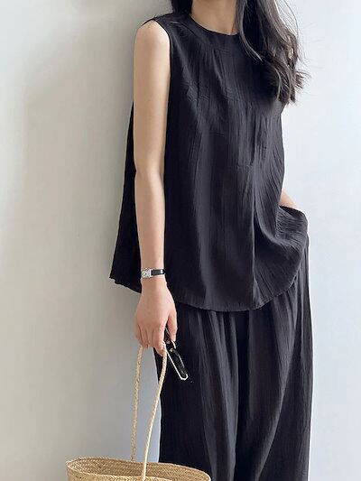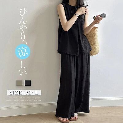 セットアップ レディース 夏 2点セット 薄手 上下セット タンクトップ ワイドパンツ イージー フレアパンツ 涼しい カジュアル ナチュラル 落ち感 ゆったり 体型カバー ふんわり 爽やか ブラック