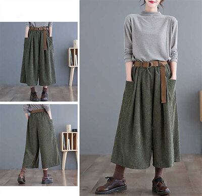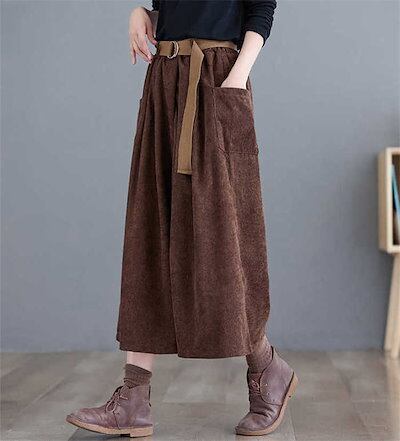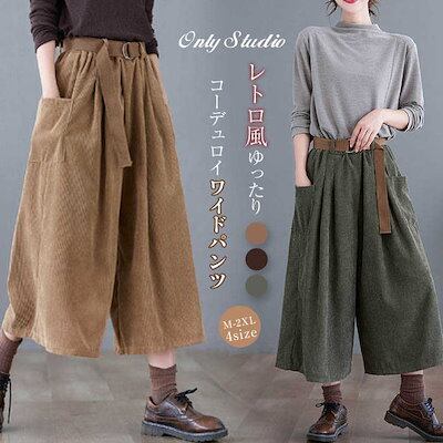 ワイド パンツ レディース コーデュロイ ワイドパンツ チノパン ボトムス チノパンツ ハイウエスト 7分丈 綿 コットン ベルト付き 無地 ゆったり 秋 冬 カジュアル ポケット 体型カバ