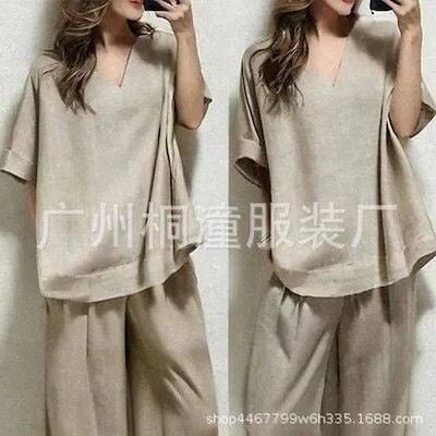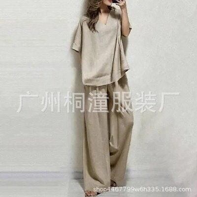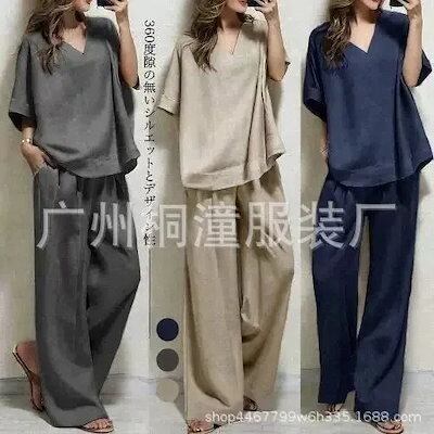大人 オシャレ 2点セット ハーフ袖トップス ウエストのタイとサイドポケット付きワイドパンツ + Vネック ゆったり レディース セットアップ