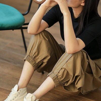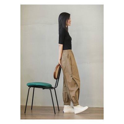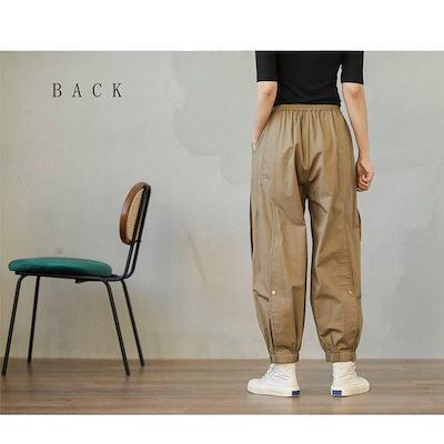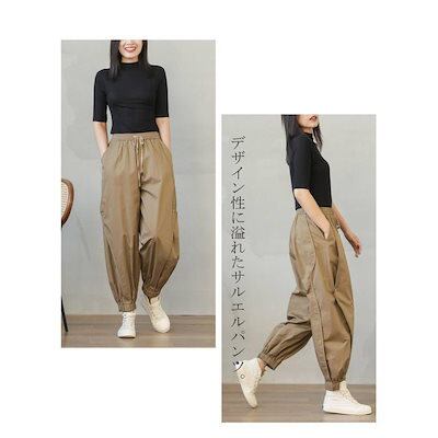 サルエルパンツ テーパードパンツ ボトムス チノパンツ ズボン レディース カジュアル 綿 ポケット付き ゆったり ウエストゴム 無地 カーキ 送料無料