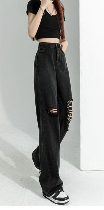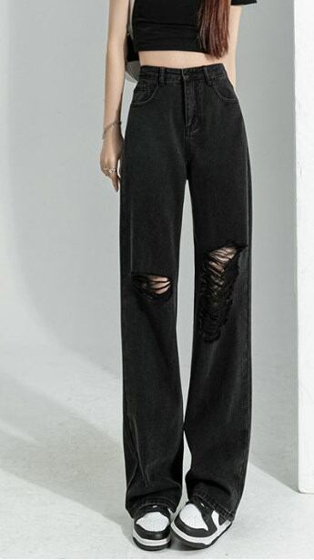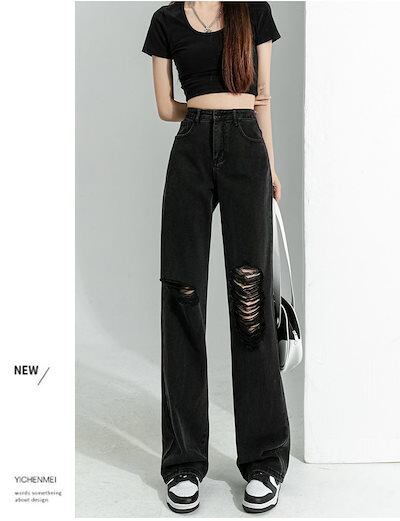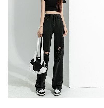 ブラック ダメージ加工 レディース 大人の魅力 春秋 薄手 2025 新作 ハイウエスト ストレート ゆったり ワイドレッグ ドレープ感 ロング丈パンツ