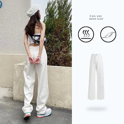 脚長効果スキニーパンツ ホワイト ワイドパンツ デニムパンツ レディース 新商品 ハイウェスト 着 痩せ ゆったり エクストラログ丈 ストレートパンツ モップパンツ