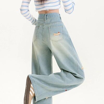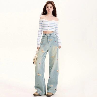 デニムかっこいいスラックスパンツシンプルカジュアル 25 ダックスフント ワイドパンツ デニムパンツ 刺繍 ハイウエストゆったり見えやせ パンツ レディース