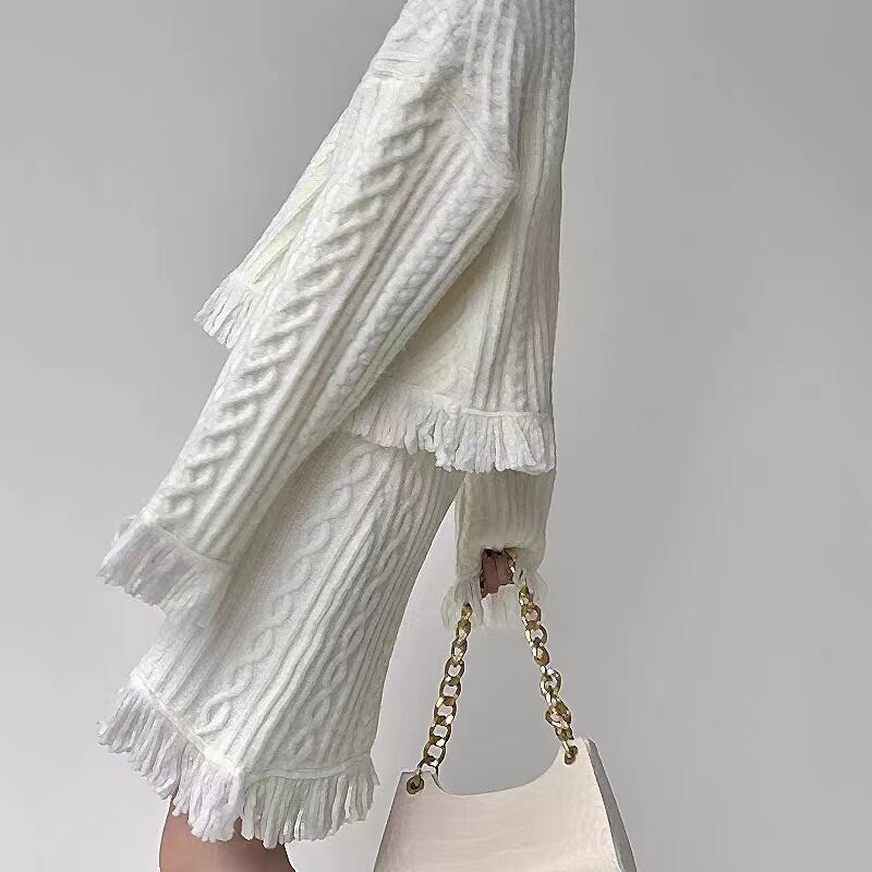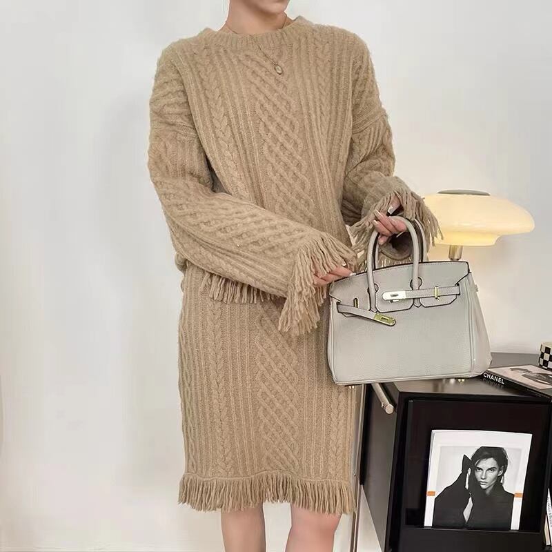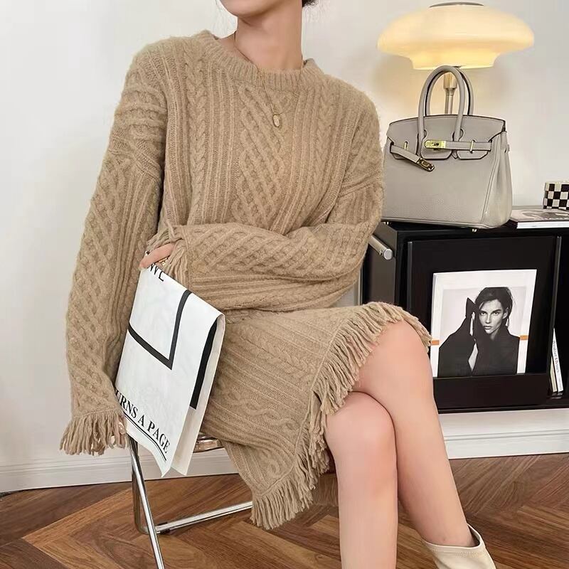 秋冬INS 新作 好感度UP カジュアル 無地 ニット生地セーター+タッセル スカート セットアップ