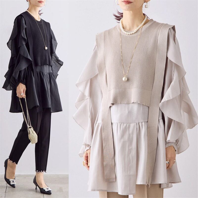 2025年INS秋新作 韓国風 気質 おしゃれ ニット+長袖シャツ 2点セットアップ